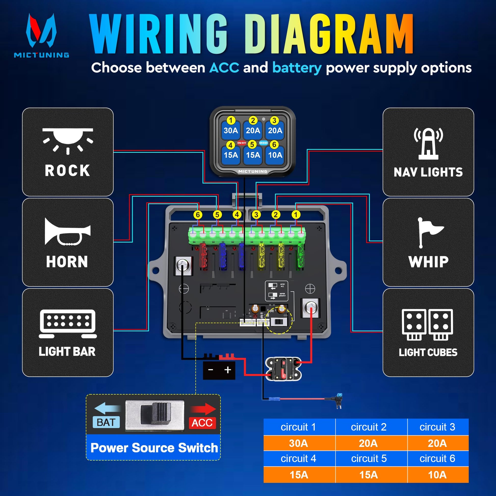 - 【Widely Use】- It is great to control 6 devices with a switch panel! You can add multiple devices to your car, such as lights, exhaust fans, speakers, stereos, etc. It is widely used in RVs, trucks, sports cars, boats, UTVs, ATVs, and more. If you have any problems, please do not hesitate to contact we. MICTUNING team guarantees a 2-year warranty & 24-hour friendly online service.