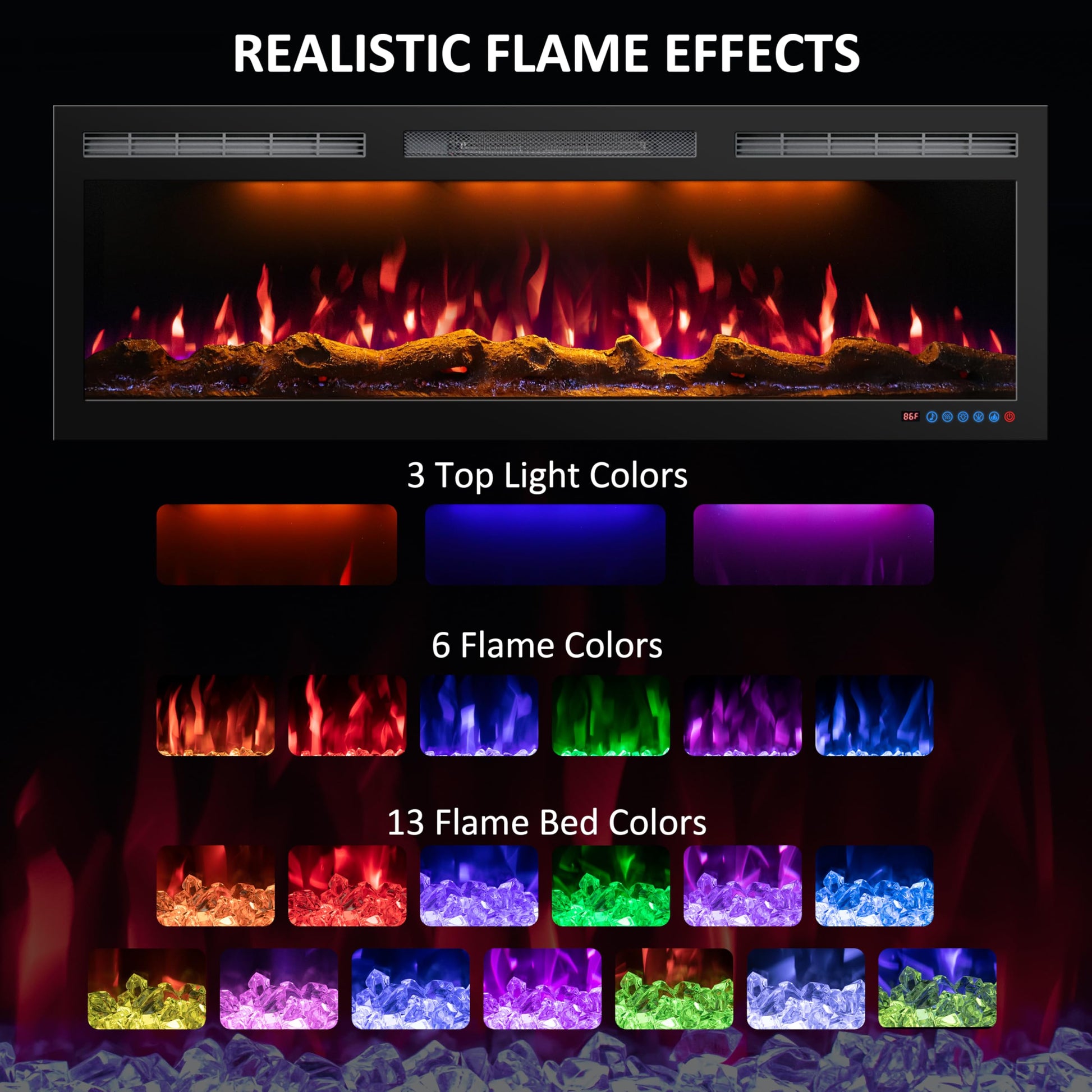 - VARIOUS FUNCTIONS: This slim fireplace heater has 3 top lights. 6 flame colors and 13 flame bed colors are available. 3 selectable Brightness. Adjust the changes according to your mood. Comes with logs and crystals and is combined with it. Perfectly reflects the realistic flame effect. The log speaker can make the real log-burning effect. 750W/1500W (heater blows warm air/hot air).