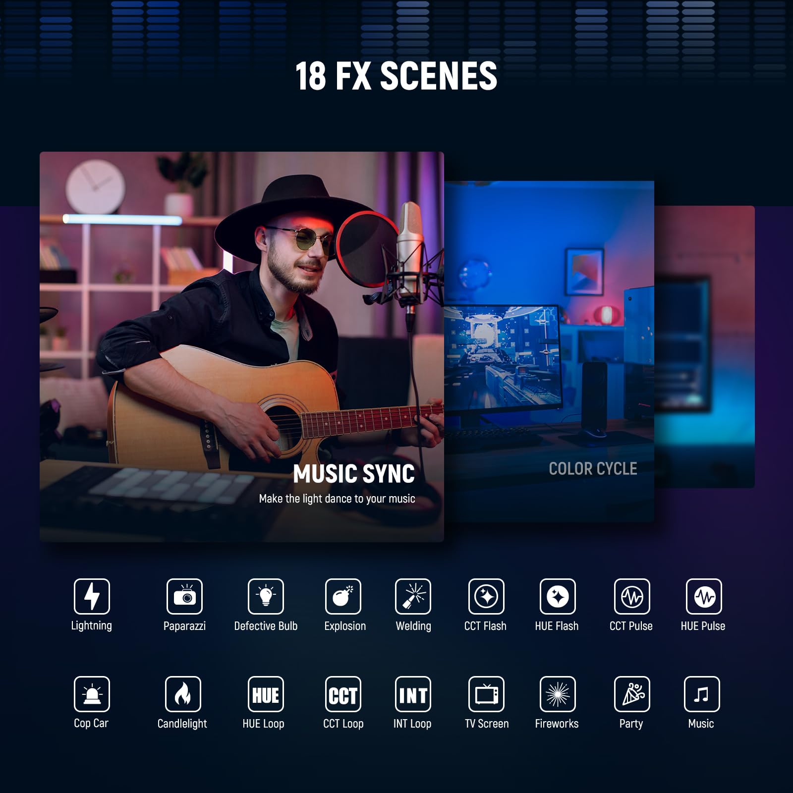 - 【Full Colors Touch Bar & 18 Special Scenes】 With RGBWW light mixing, the computer lighting enables 2900K-7000K color temperature adjustment and ±50 GM color correction. In HSI mode, tones, saturation, and intensity are independently adjustable to get 36000 colors. 18 FX scene effects contain a Music Sync mode that makes the lighting 'dance' to the rhythms. The control panel is easy to use, and an upgraded touch bar allows color pickup with a glide of the finger (Color Picker is supported in the 'NEEWER' app)