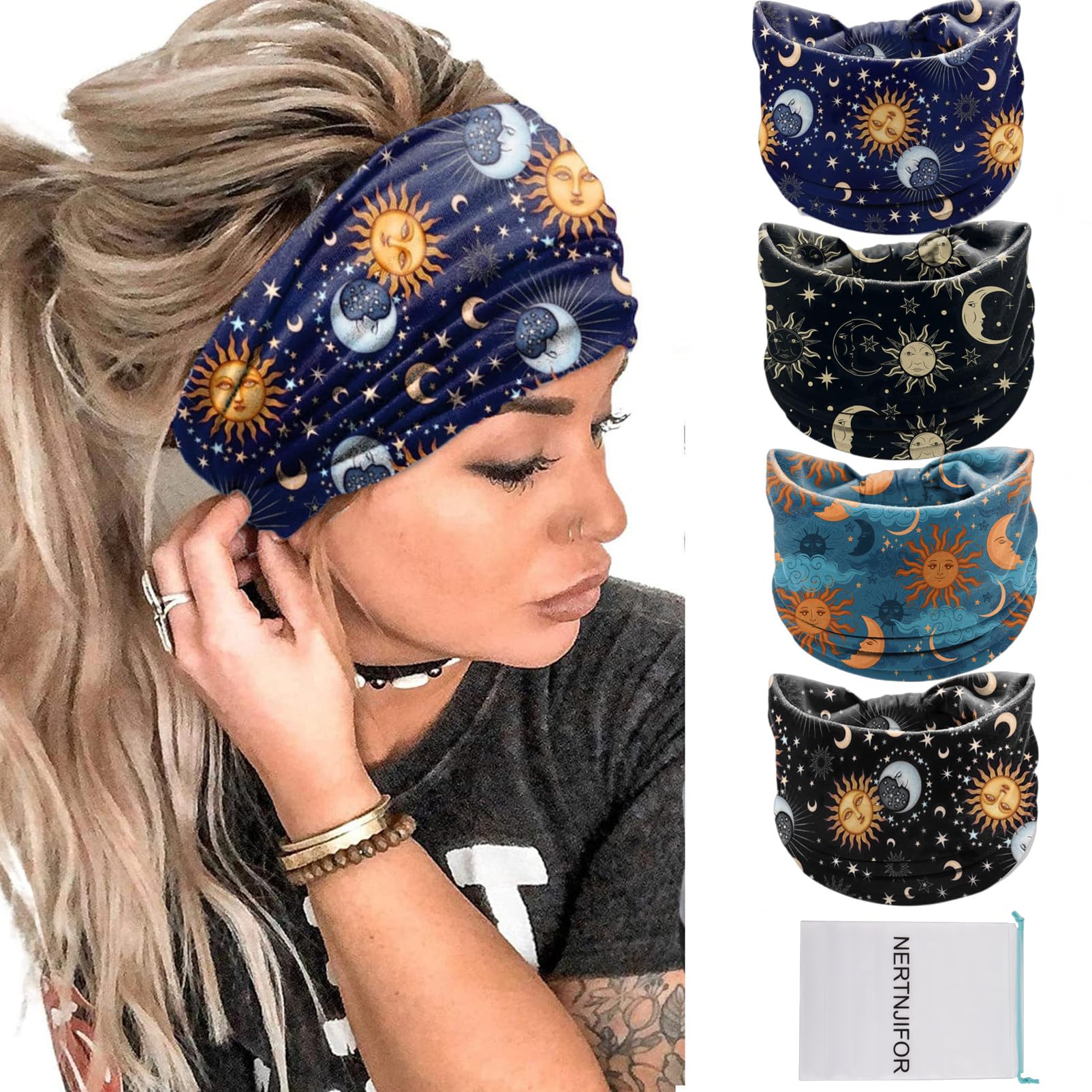 NERTNJIFOR Women Headbands Stars Moon Wide Knotted Headband Non Slip Wraps Elastic Yoga Turban Fashion Hair Bands Soft Hair Wrap Hair Accessories for Girls Pack of 4 (Star Moon)