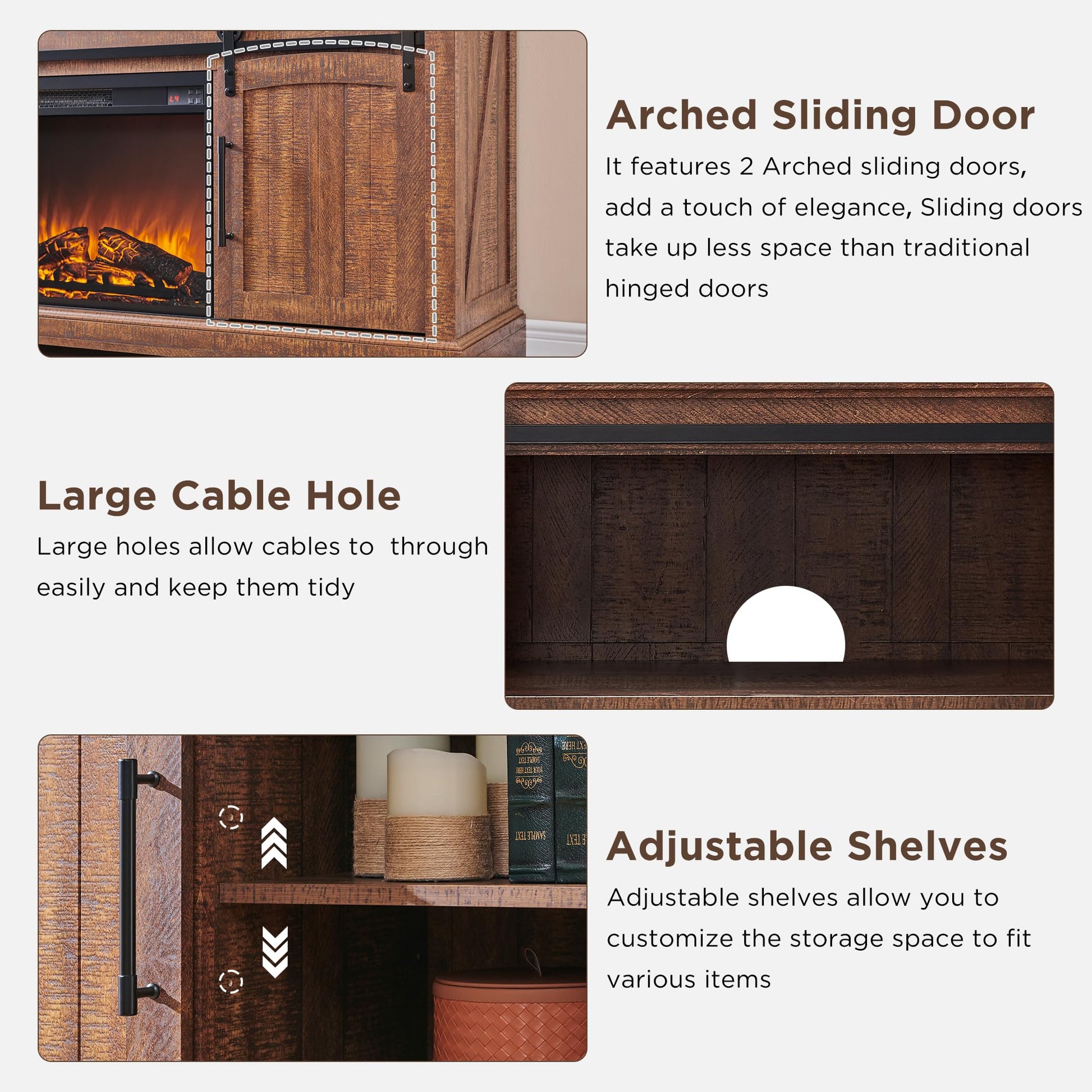 - Exquisite Farmhouse Fireplace TV Stand: OKD Fireplace tv stand features an exquisite sliding arched door and retro metal decor. Its unique distressed finish is wonderfully eye-catching, and it has natural variations in grain, color, and texture, giving every piece a unique look, and easily creating a rustic, charming, cozy living room. Matches perfectly with other furniture.