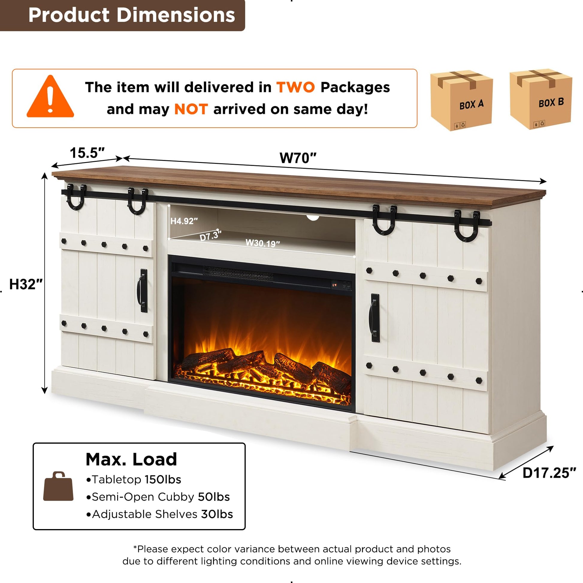 - NOTE: TV Stand and Fireplace are sent separately due to their large size, this means you will receive TWO packages. Please be aware the box may NOT arrive together! If you only receive one package, please do not worry, the second package will usually arrive within the next few days.