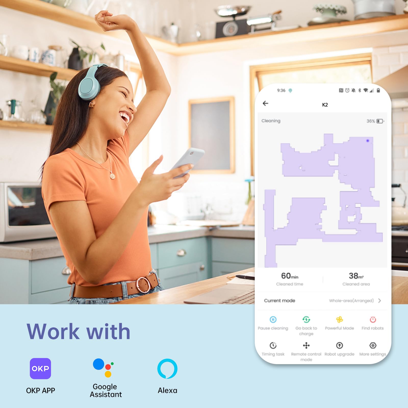 - 💡Smart App & Easy Control:You can easily create a home clean schedule, change the clean mode, and control the clean direction by using the OKP app. The auto vacuum cleaner robot is also work with Alexa and Google Assistant, allowing users make the robot start and stop the clean by voice commands. Use robots to save you time and energy!