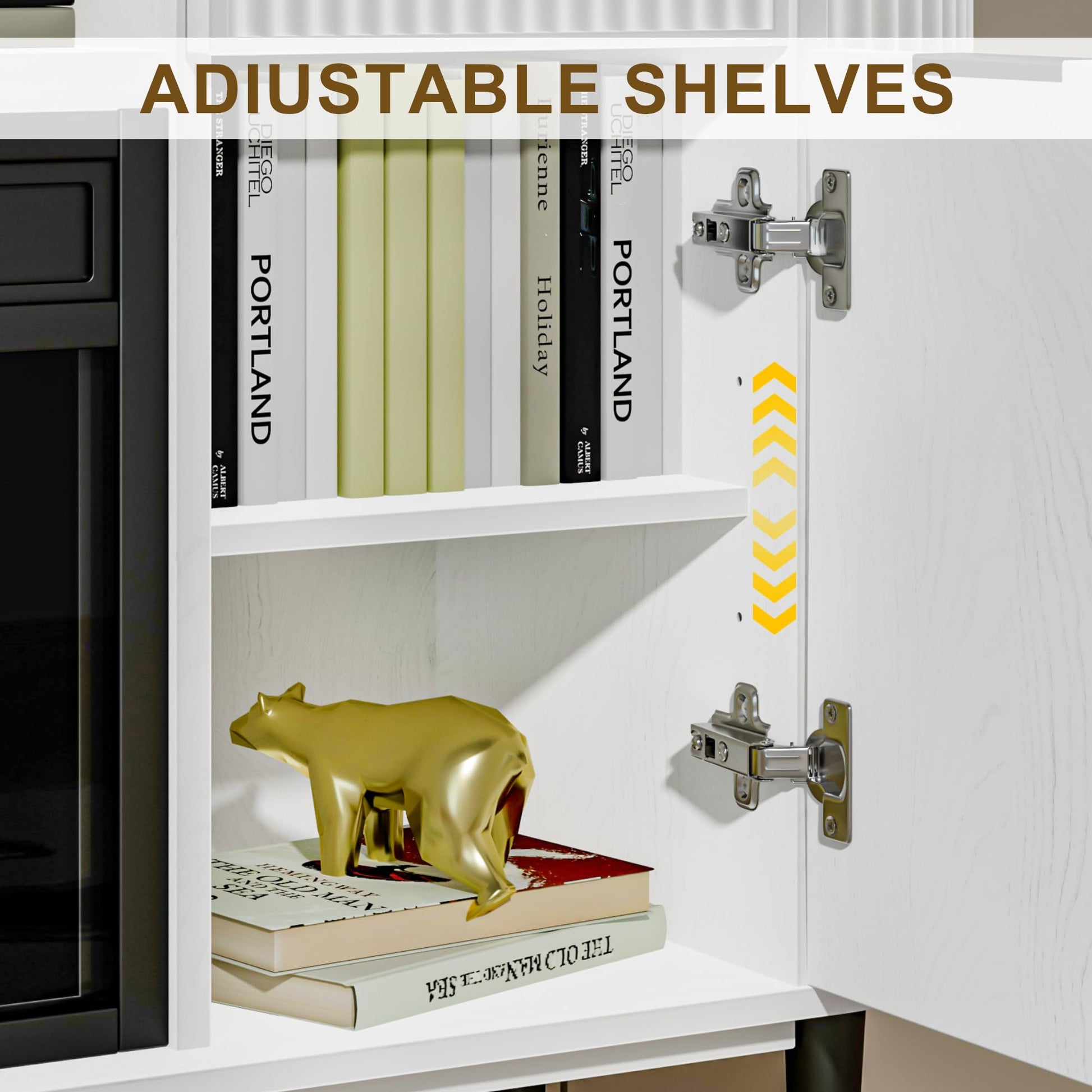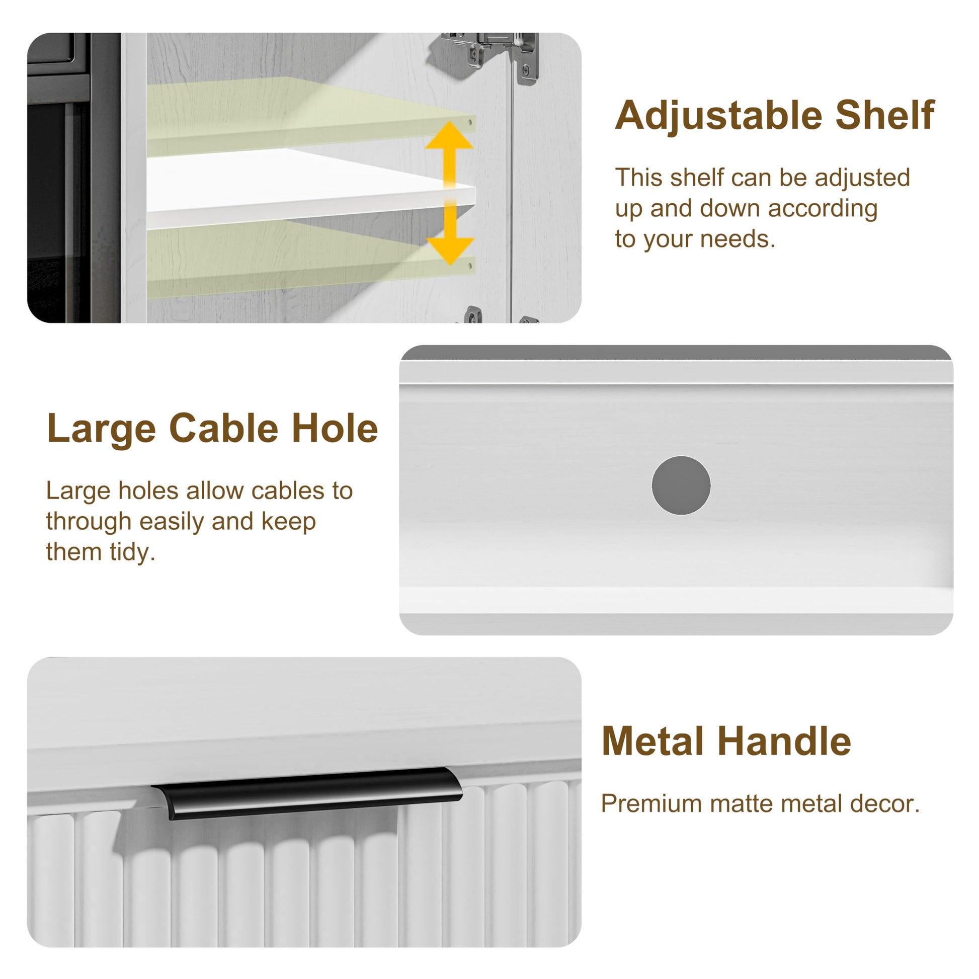 - 【User-Friendly Design】The back panel has a pre-drilled wire management hole for you to organise your messy wires and keep your living room looking neat and organised! Adjustable dividers inside the cabinet as well as adjustable feet will allow you to use it more conveniently.