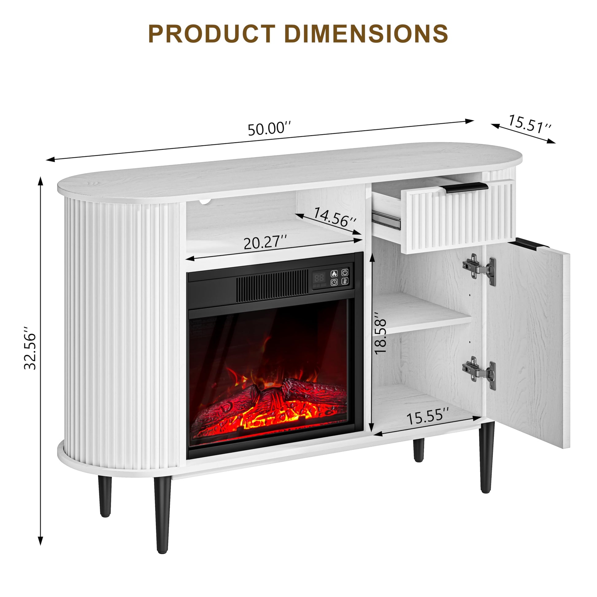 - 【Electric Fireplace Dimensions】Dimensions: 50'L X 15.51'W X 32.56'H. The distinctive wavy look and curved silhouette, while featuring a unique design, also allows it to be effortlessly paired with other contemporary furniture styles.