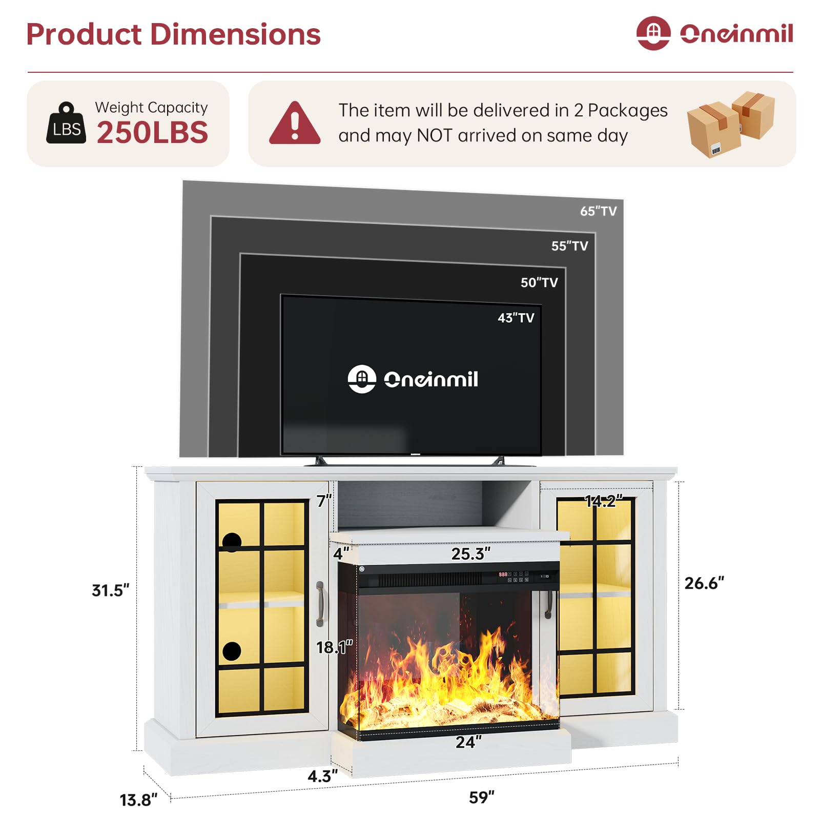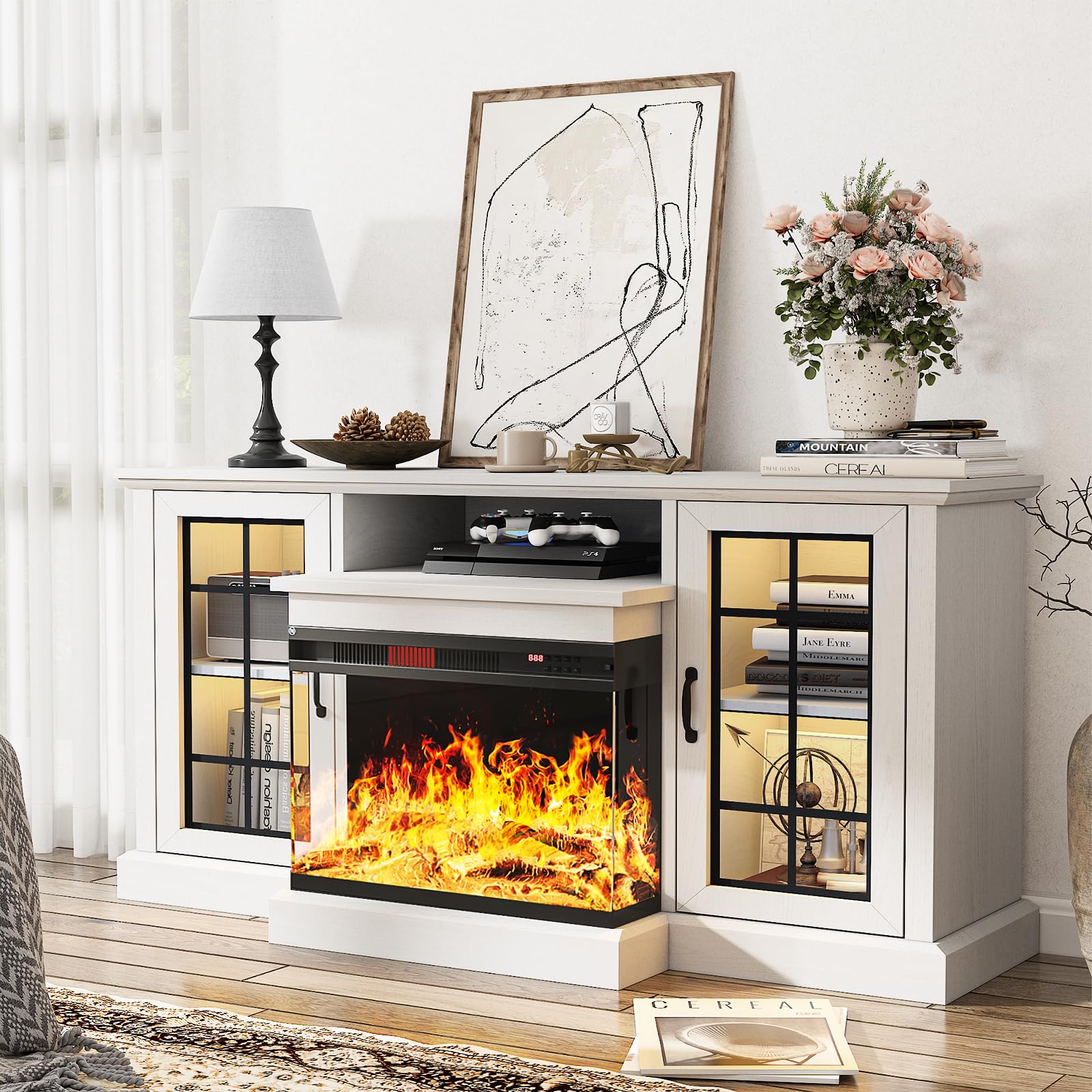 oneinmil 59'' Fireplace TV Stand, 3 Sided Glass Media Entertainment Center Console Table for TVs up to 65'' with Glass Door Adjustable Flame LED Color for Living Room, Set of TV Table, White