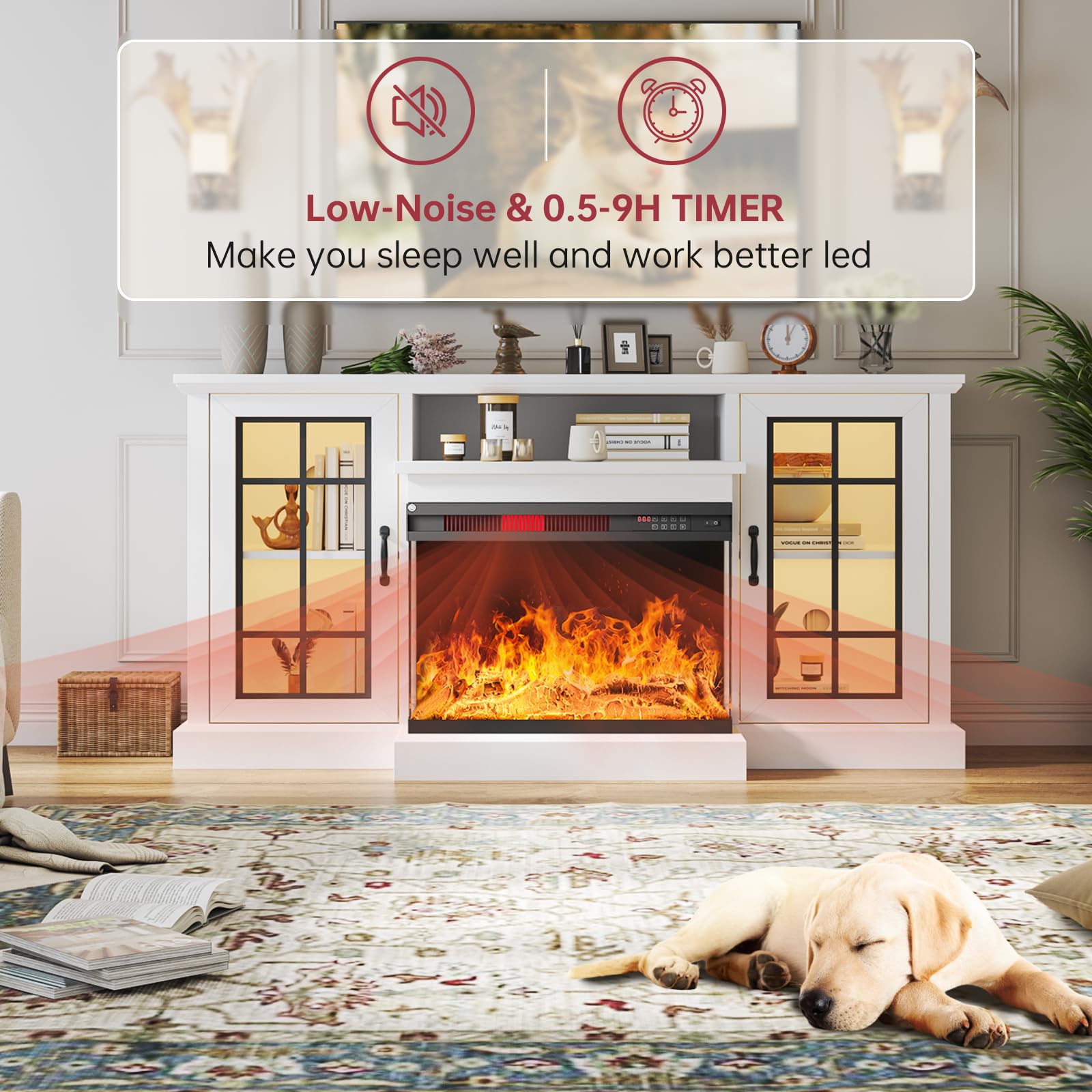 - 3-Side Glass Display Fireplace: The fireplace is designed to offer a wide view of the fire from three sides. This creates a stunning visual effect. Featuring 5 settings for flame brightness, 12 colors of backlight and 12 LED colors of light strips