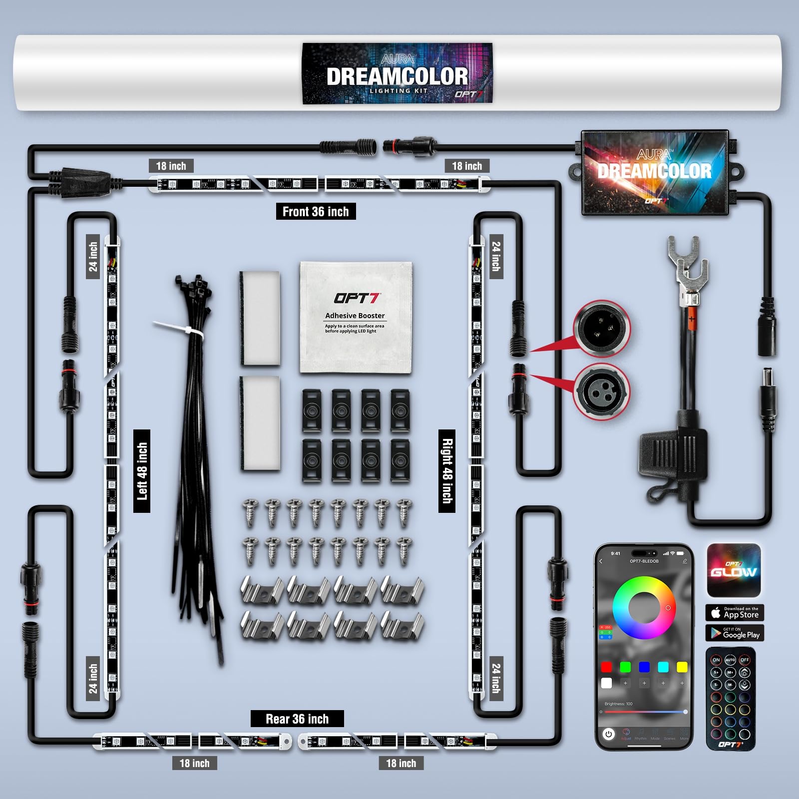 - [Dual Control Power: OPT7 GLOW APP & Remote] Elevate your driving experience with the new OPT7 GLOW APP or Wireless Remote at a single tap! From vibrant animated effects to infinite color choices, effortlessly customize your rig’s lighting and party to the beat with music-sync. OPT7 GlOW - Compatible with iOS 7 and above or Android 4.3 and above.