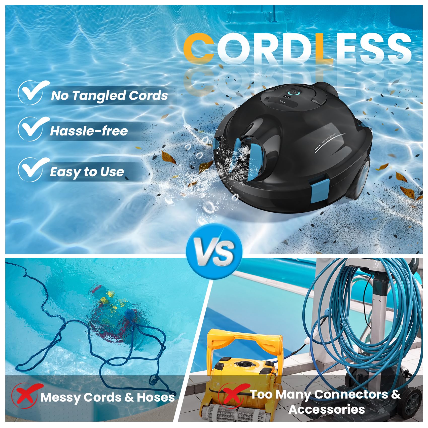 - 【True Cordless Freedom & 90-Min Runtime】- Enjoy hassle-free cleaning with the cordless design—no pumps, hoses, or cords required! The 5200mAh battery provides 90 minutes of runtime, covering 1100 sq.ft pools in a single charge. Perfect for most of pools.