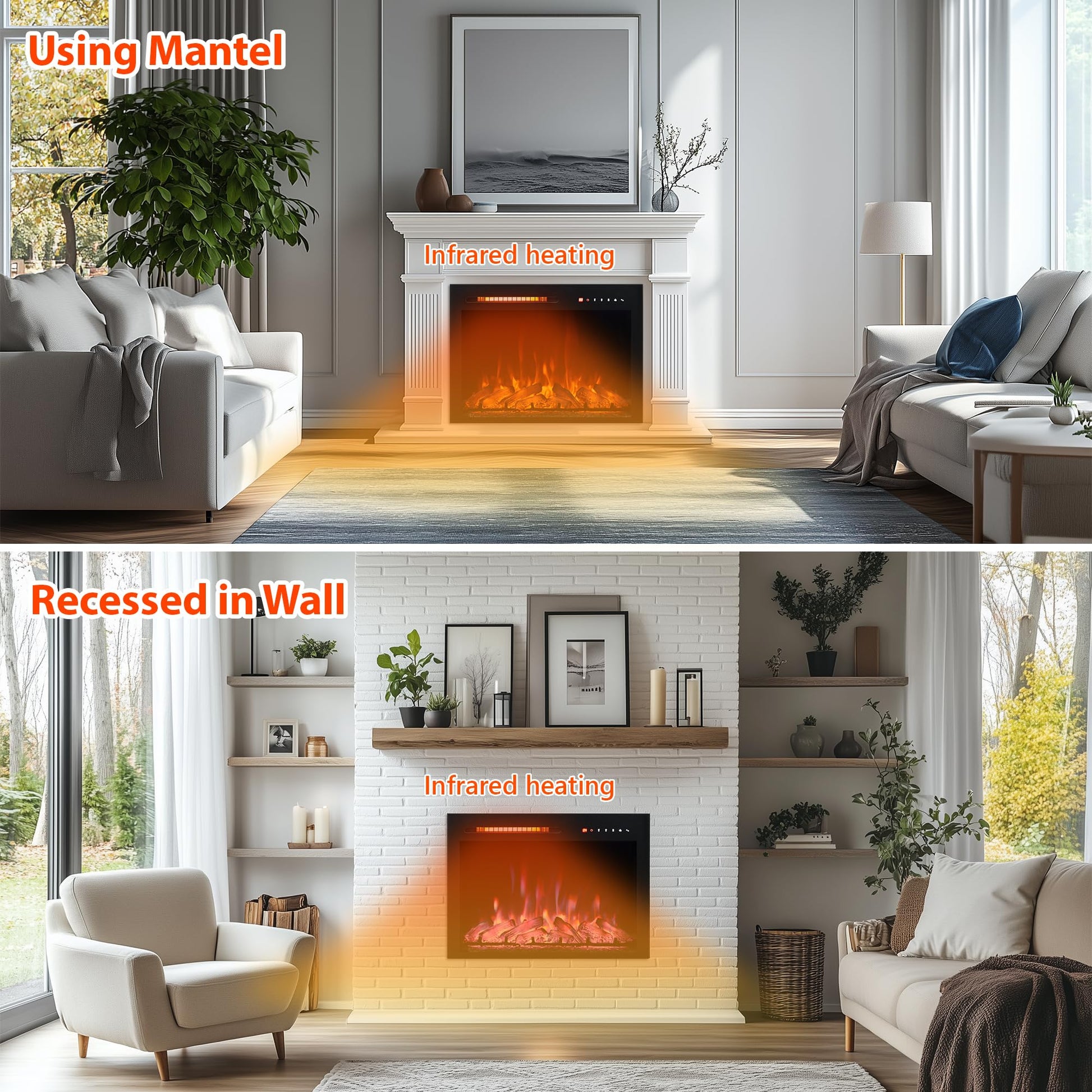 - 【Two Installation Method】Wall mounted/Recessed electric fireplace Inserts in wall or TV stand. All installation methods are save space. The operation is simple, just assemble the bracket on the wall or remove the bracket and insert it into the wall.