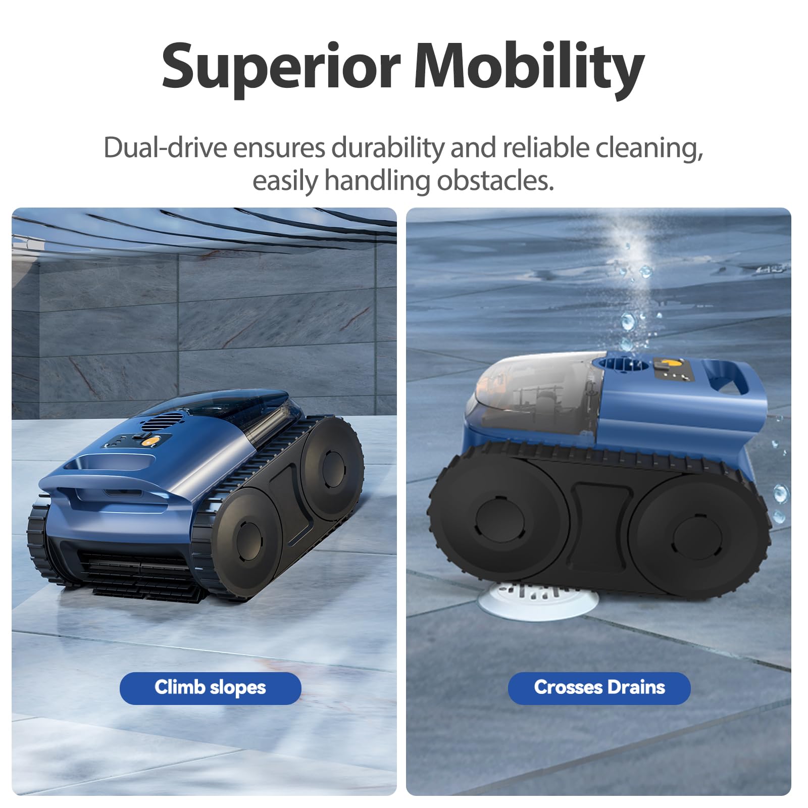 - Deep Cleaning for Walls & Waterline: Built for outstanding cleaning performance, this robot goes beyond the floor—it climbs and scrubs walls and the waterline. Whether your pool is curved, angled, or uniquely shaped, it adjusts accordingly to deliver a complete and deep clean.
