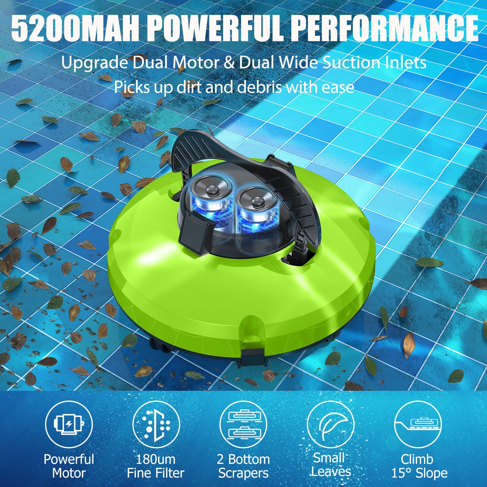 - 120 Mins Runtime & 5200mAh Battery: The pool vacuum offers an astonishing 120 minutes of continuous cleaning. The robot pool vacuum can cover pools up to 1000 sq. ft, providing higher efficiency and better value. And pool vacuum supports fast charging in just 4 hours, so you can quickly get it back to work for regular pool maintenance.
