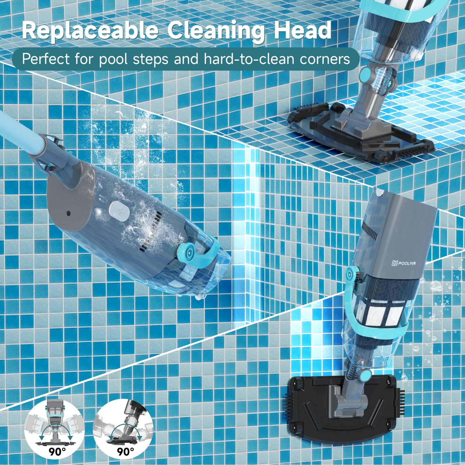 - Works with Pool Robot: Our handheld pool vacuum also perfectly complements your robotic pool vacuum. While your robot pool vacuum handles the large areas, the handhled pool vacuum helps you tackle those tricky spots it might miss—like stubborn corners, stairs, walls, and tight spaces. Together, they ensure a spotless pool with minimal effort