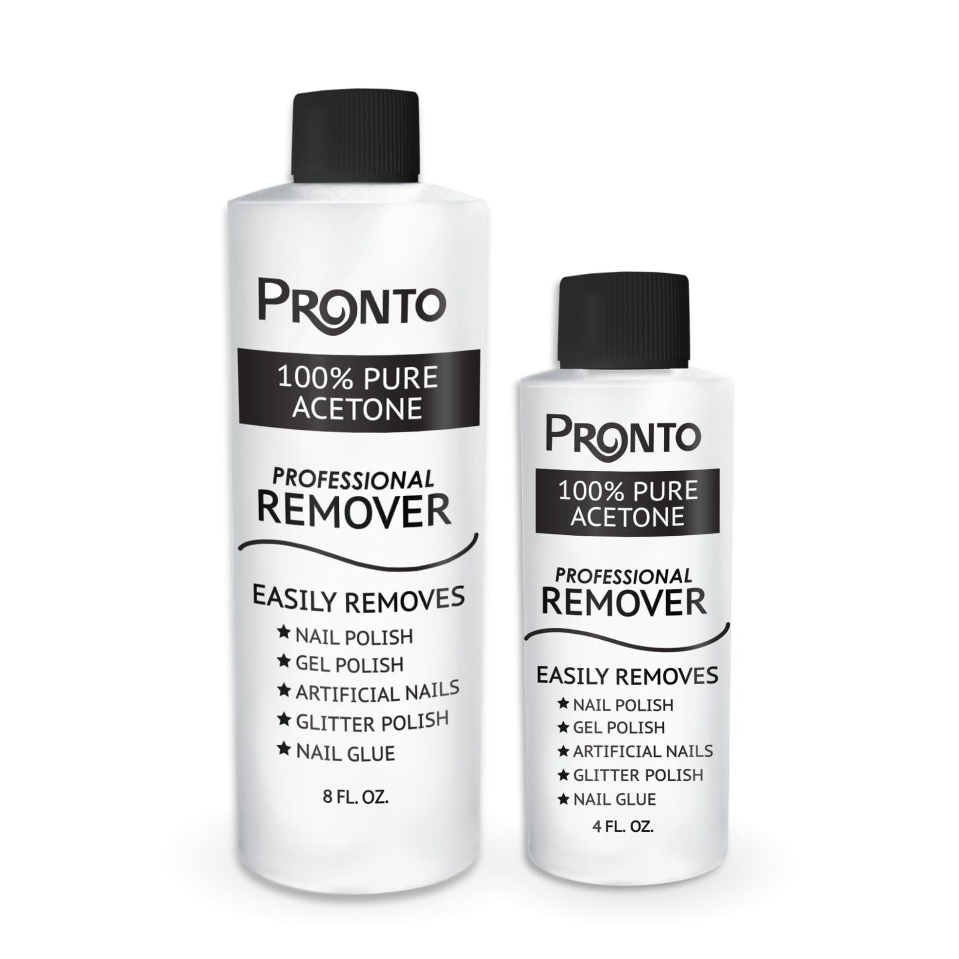 - THE ONLY ONE YOU NEED: Pronto Pure Acetone easily removes nail polish, gel or shellac polish, sculptured nail forms and nail art, artificial nails, glitter polish or nail glue. You can use our professional acrylic nail remover straight from our bottle or from an acetone dispenser.