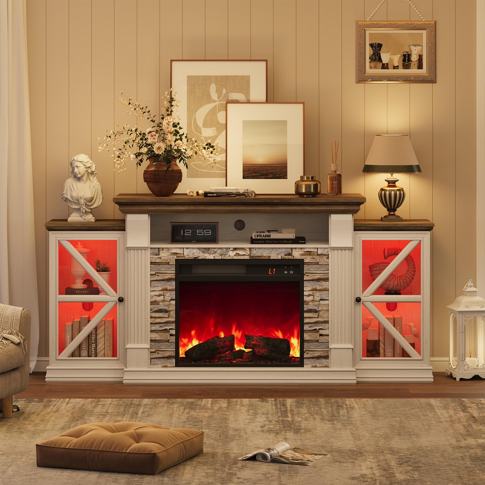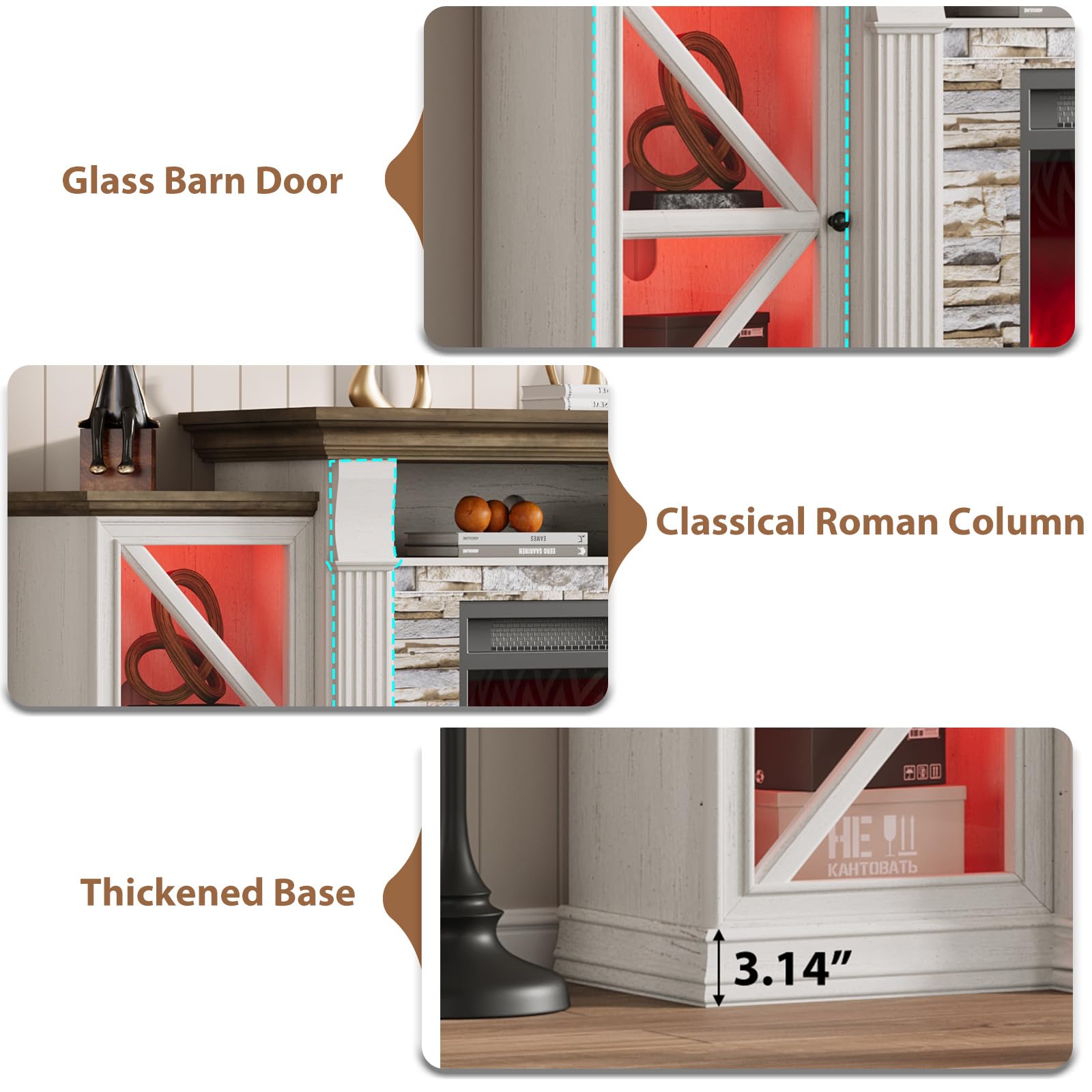 QUW Electric Fireplace TV Stand, 70" Farmhouse Entertainment Center with Open Shelf and Glass Barn Door Cabniet, Modern TV Console Table with 7 Flame Colors for Living Room, Antique White