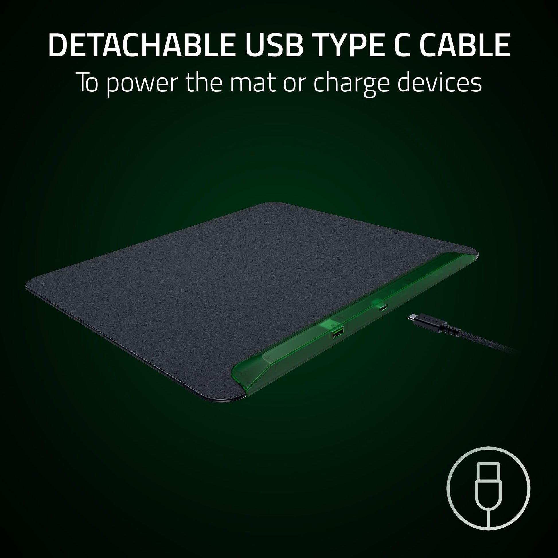 - DETACHABLE USB TYPE C CABLE — At the end of a long gaming session, quickly swap from powering the mouse mat to charging a wireless mouse or any other USB Type C devices
