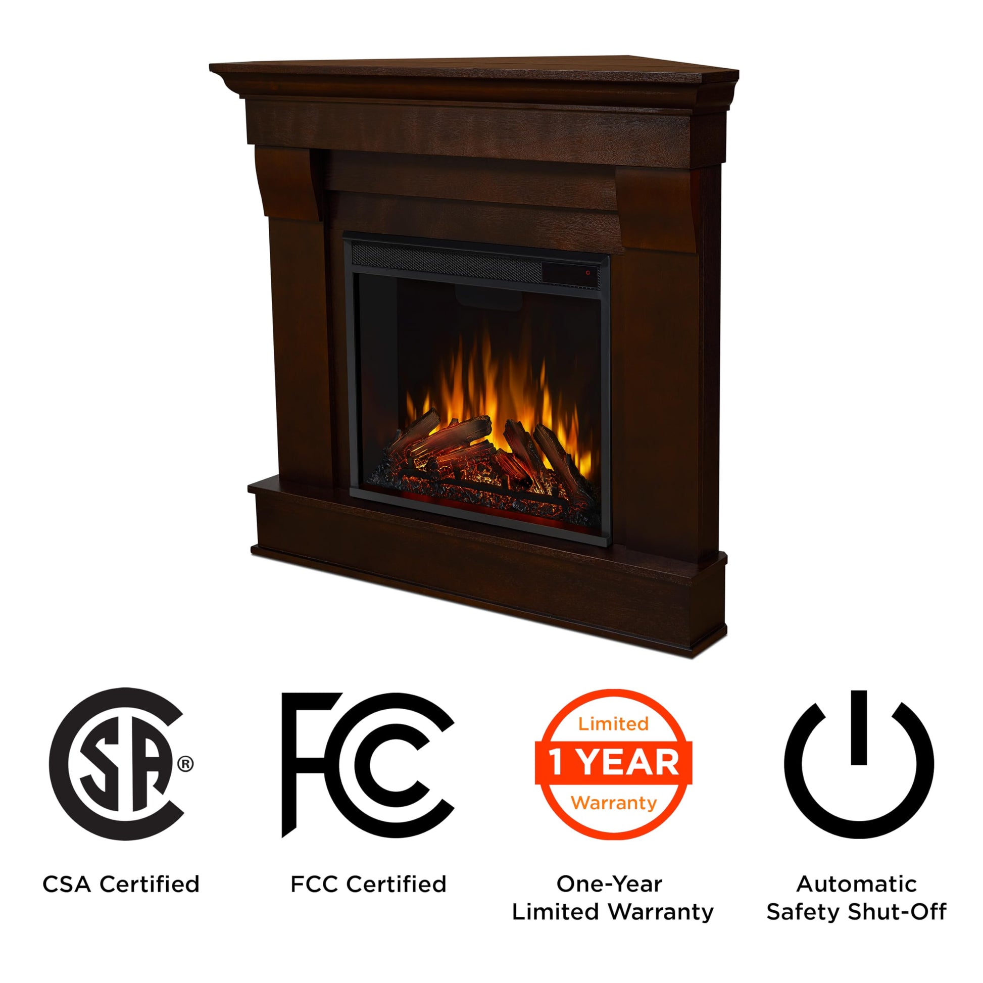 Details: The Chateau corner electric fireplace features the clean lines and classic styling familiar to stone mantels, realized in wood. In three great finishes, this design is sure to compliment a variety of decor from classic to contemporary. The vividly electric firebox plugs into any standard Outlet for convenient set up. The features include remote control, programmable thermostat, timer function, brightness settings, and ultra bright vivid flame led technology. Available in Dark Walnut, espresso, and white.