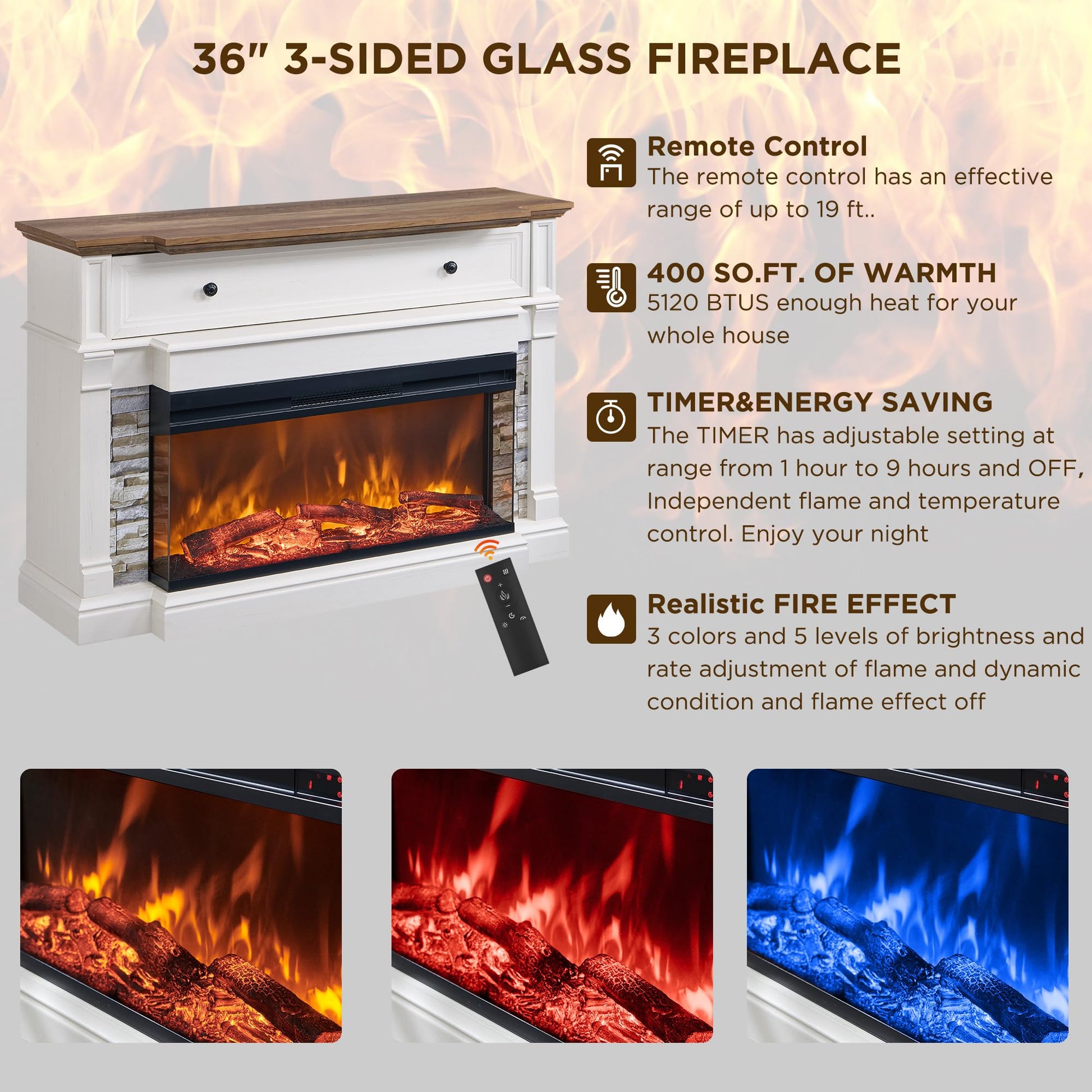 - 3-Sided Glass Panoramic Display: This panoramic fireplace media console blends the classic mantel with farmhouse elements to create a realistic 3D flame effect. Whether heated or not, the quiet fireplace offers three color options and dynamic changes to create a beautiful flame effect. You can enjoy the flame scenery from anywhere in the room, allowing you to get a visual experience from different angles, adding warmth and a unique decorative feel to your space