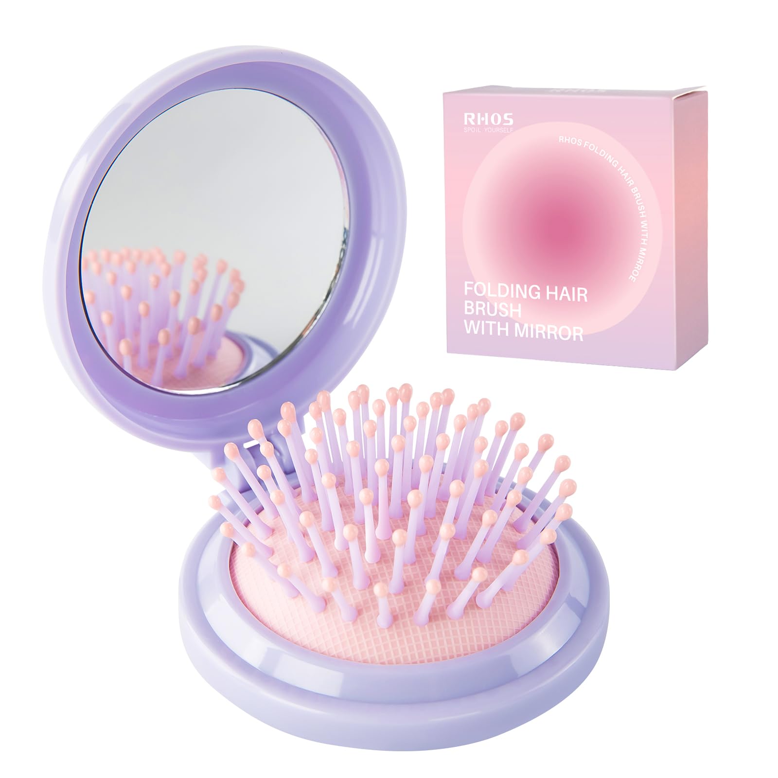 RHOS Hair Brush with Mirror for Women, Girls - Compact Folding Brush with Soft Nylon Bristles and Mirror - Portable Hair Brush for Travel (Purple)