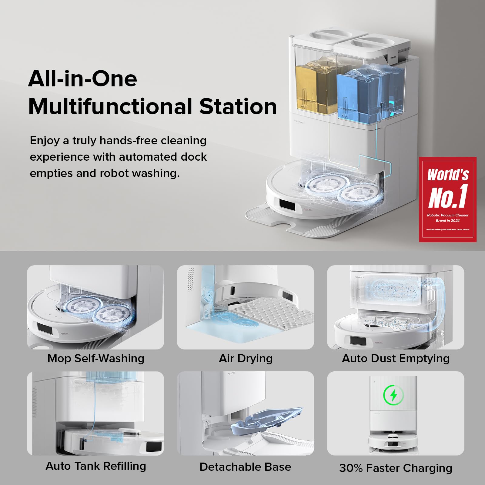 - All-in-One Docking Station: Designed for ultimate convenience, the advanced docking station automatically empties dust into a sealed 2.7L bag with 7-week duration, refills the water with a 4L tank for 3552 sqft coverage, thoroughly washes mopping pads and dries them, ensuring the robot vacuum and mop always ready for the next cleaning.