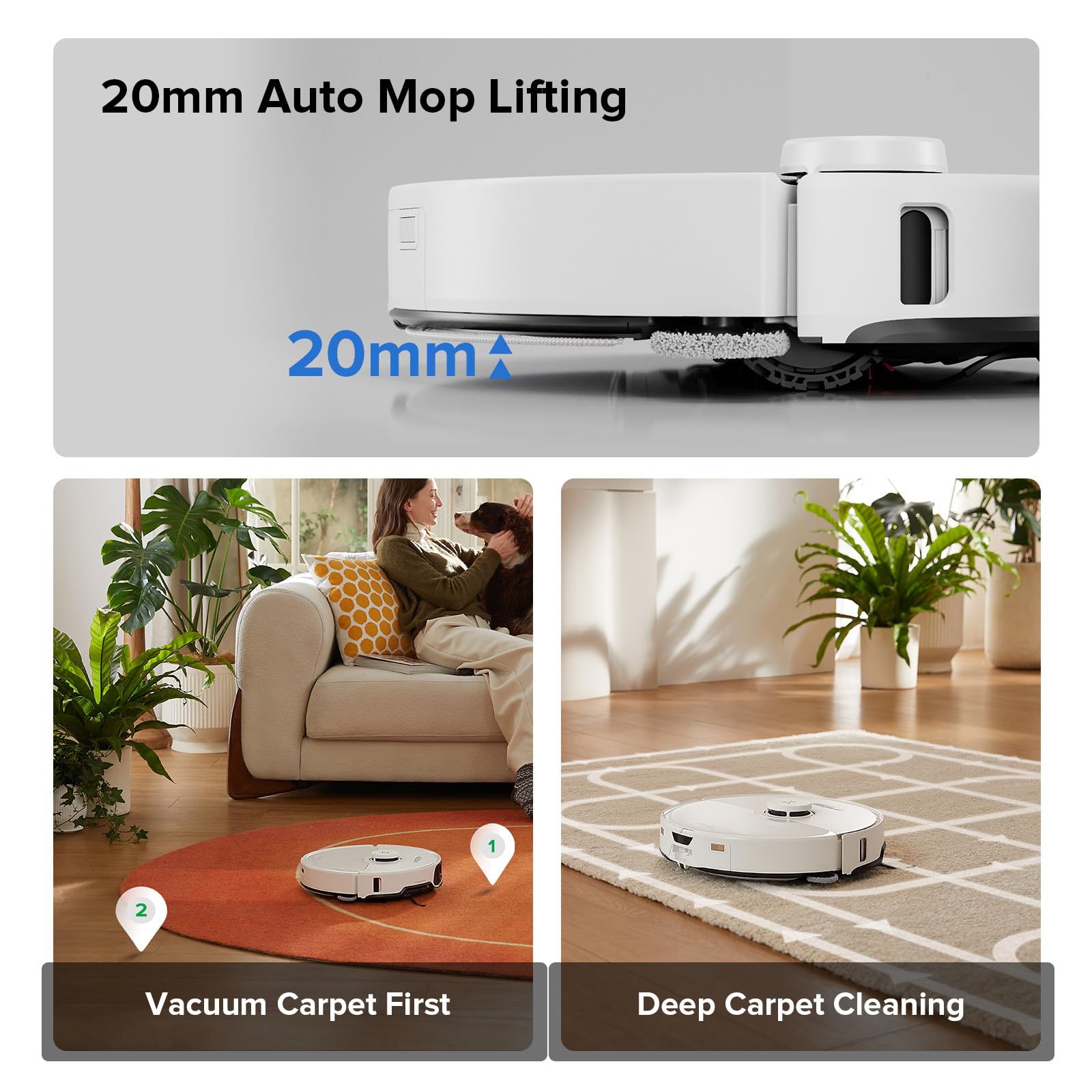 - Efficient Carpet Care - With 20mm Auto Mop Module Lifting, the S8 Max Ultra lifts the mop automatically while cleaning carpets, preventing unwanted dampness. And take advantage of the Roborock app to access a range of carpet cleaning options. Choose from vacuuming carpets first, deep carpet cleaning, or activating carpet boost mode to tailor your cleaning experience to suit your specific preferences.