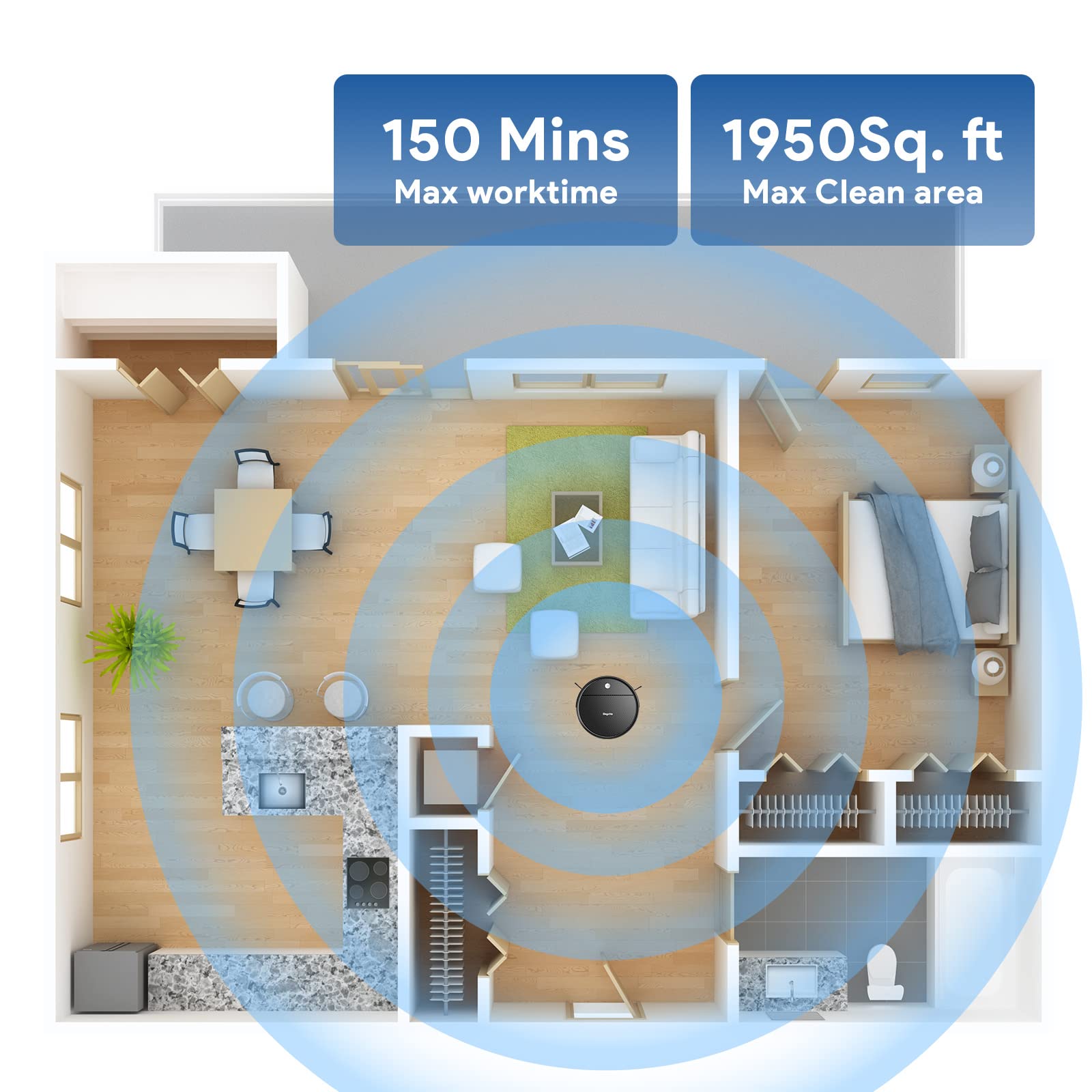 - 【150mins Runtime & Self-charging】With 2600mAh battery capacity, the robotic vacuum cleaner is a dependable helper for big house cleanings as it offers an extended runtime of 150 minutes, and the maximum cleaning area can reach 1950ft². For a seamless and thorough cleaning cycle, it automatically goes back to the charging dock to recharge.