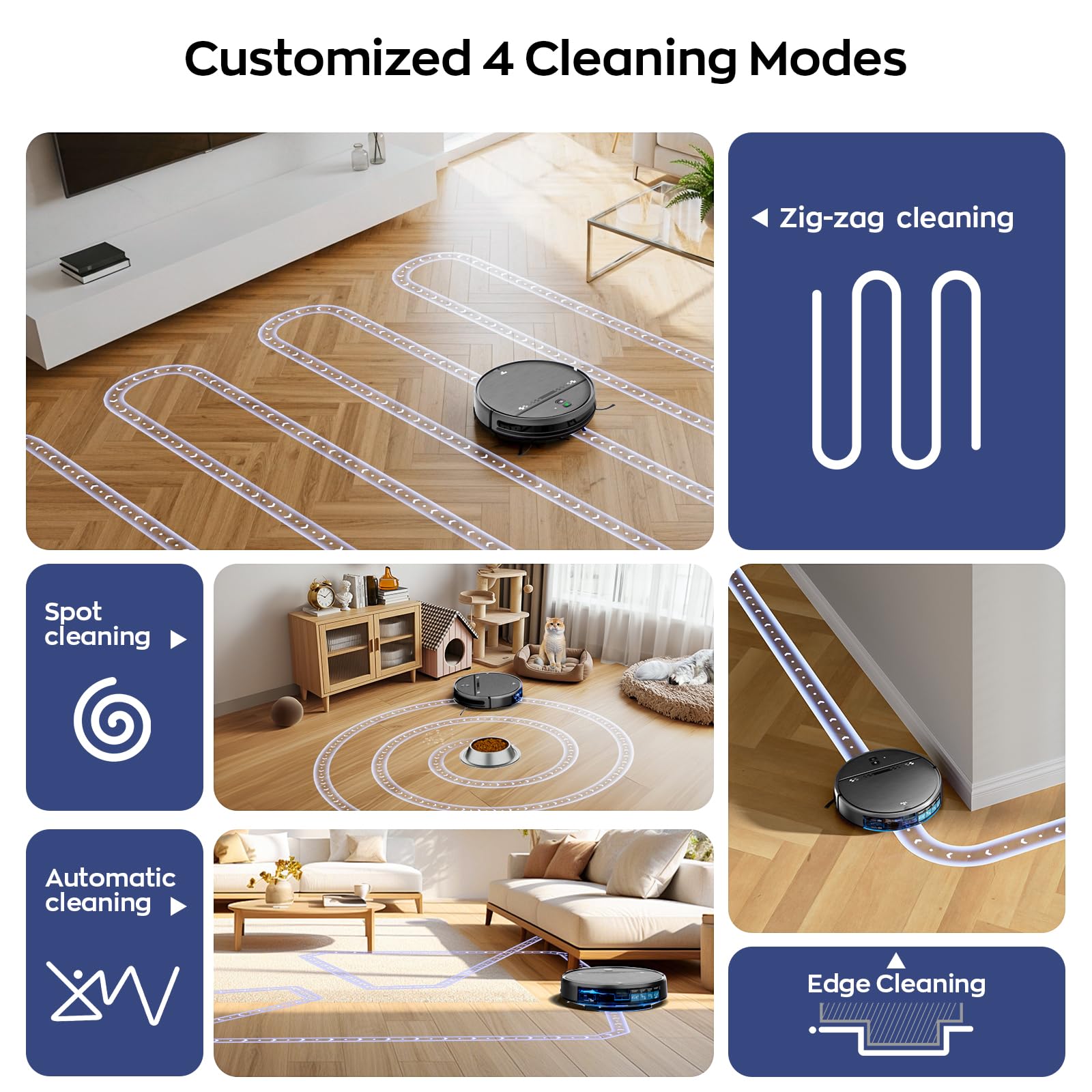 - Smart App & Voice-Controlled Floor Robot: Seamlessly control your smart vacuum and mop robot via the Tuya Smart App (2.4GHz WiFi required) or voice commands through Google Assistant. Schedule cleanings, switch modes (Auto/Spot/Edge/Zig-zag), and monitor progress remotely. Its zig-zag path navigation boosts coverage by 30%, making it the best robotic vacuum cleaner for large homes up to 1,290 sqft.