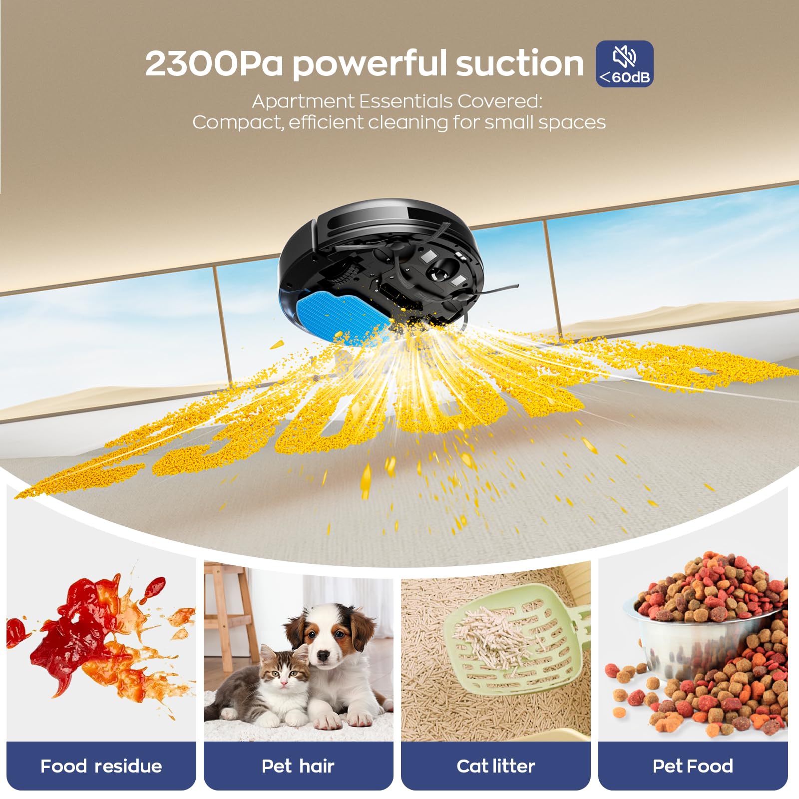 - Premium 2-in-1 Robot Vacuum and Mop Combo: Elevate your home cleaning with this intelligent robot vacuum and mop combo, engineered to tackle dust, paper scraps, pet hair, and stubborn debris effortlessly. Boasting 2300Pa max suction power with dual adjustable modes, this slim flat robot vacuum conquers every crumb while its advanced non-rolling brush design prevents hair tangles—perfect for pet owners and families with hardwood floors.