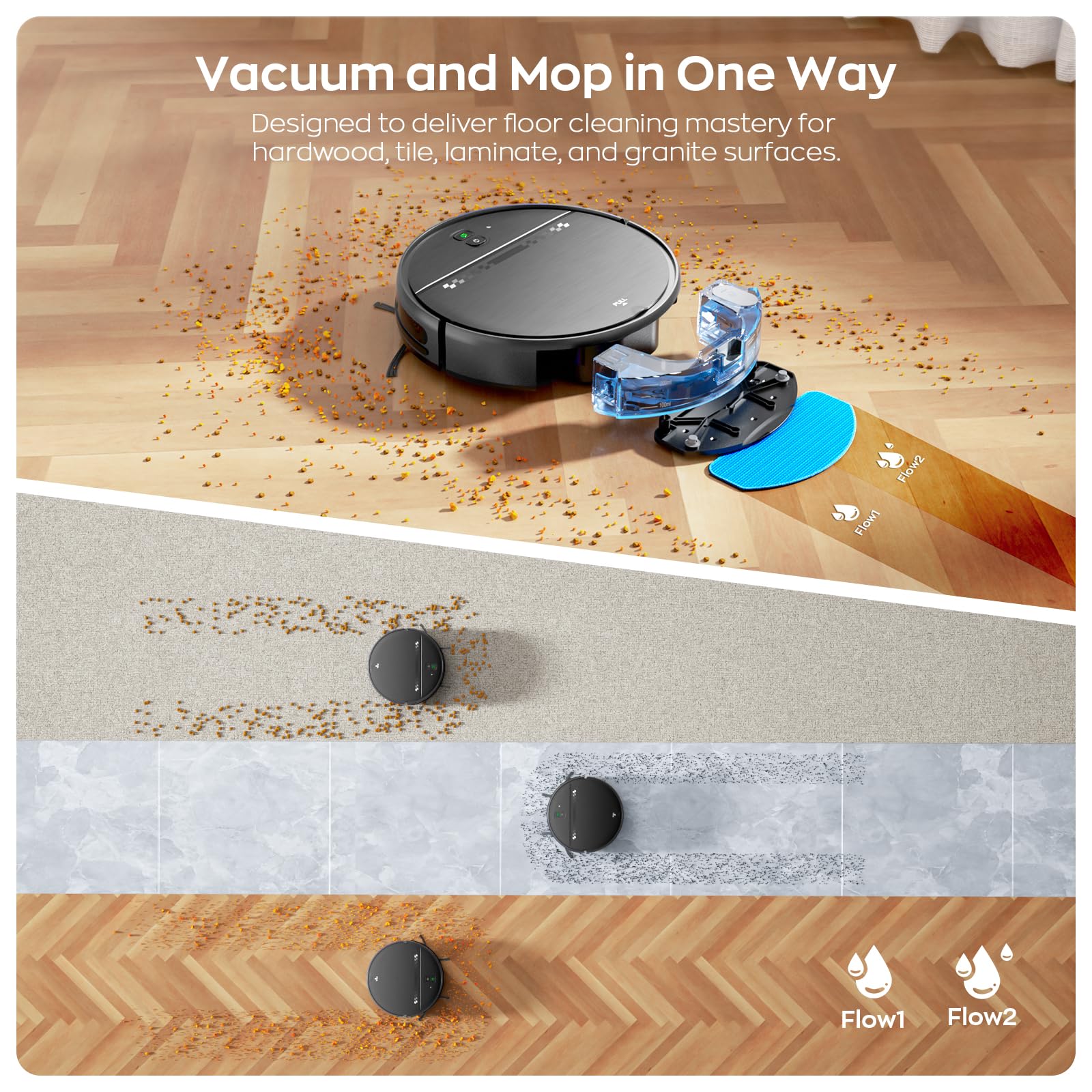 - Multi-Surface Mastery for Hard Floors: Transform your laminate, tile, granite, or parquet floors with the electric-control mopping robot vacuum. Choose between two water tank settings for light spills or deep stains. As a hardwood floor vacuum and mop in one, it leaves surfaces gleaming without scratches—no more manual scrubbing!