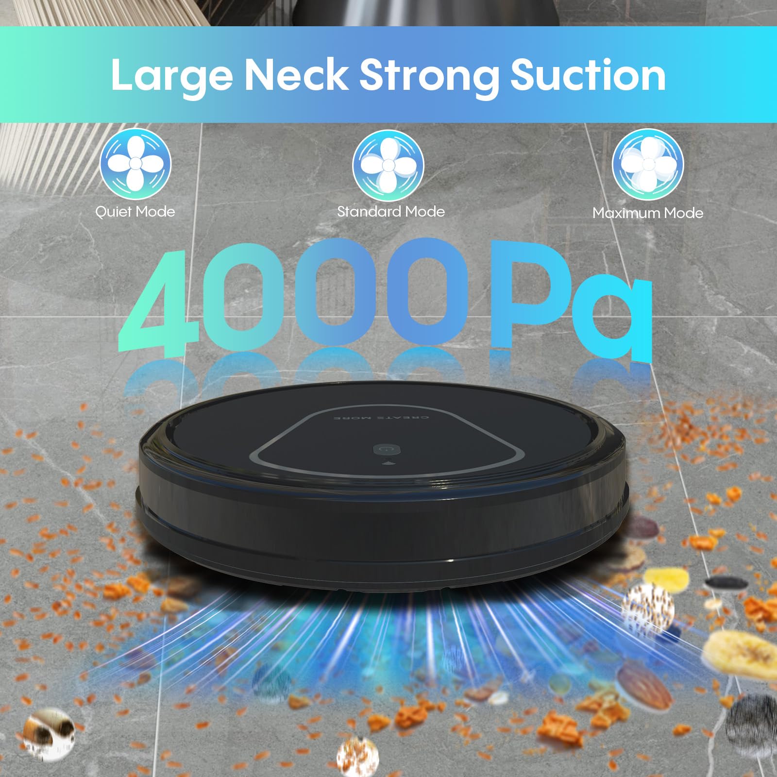 - 【4000Pa Super Strong Suction】The robot vacuum cleaner delivers deep-cleaning strength, effortlessly lifting debris, pet hair, and embedded dust,and the dual rotating side brushes are designed to suck in debris from corners and edges.