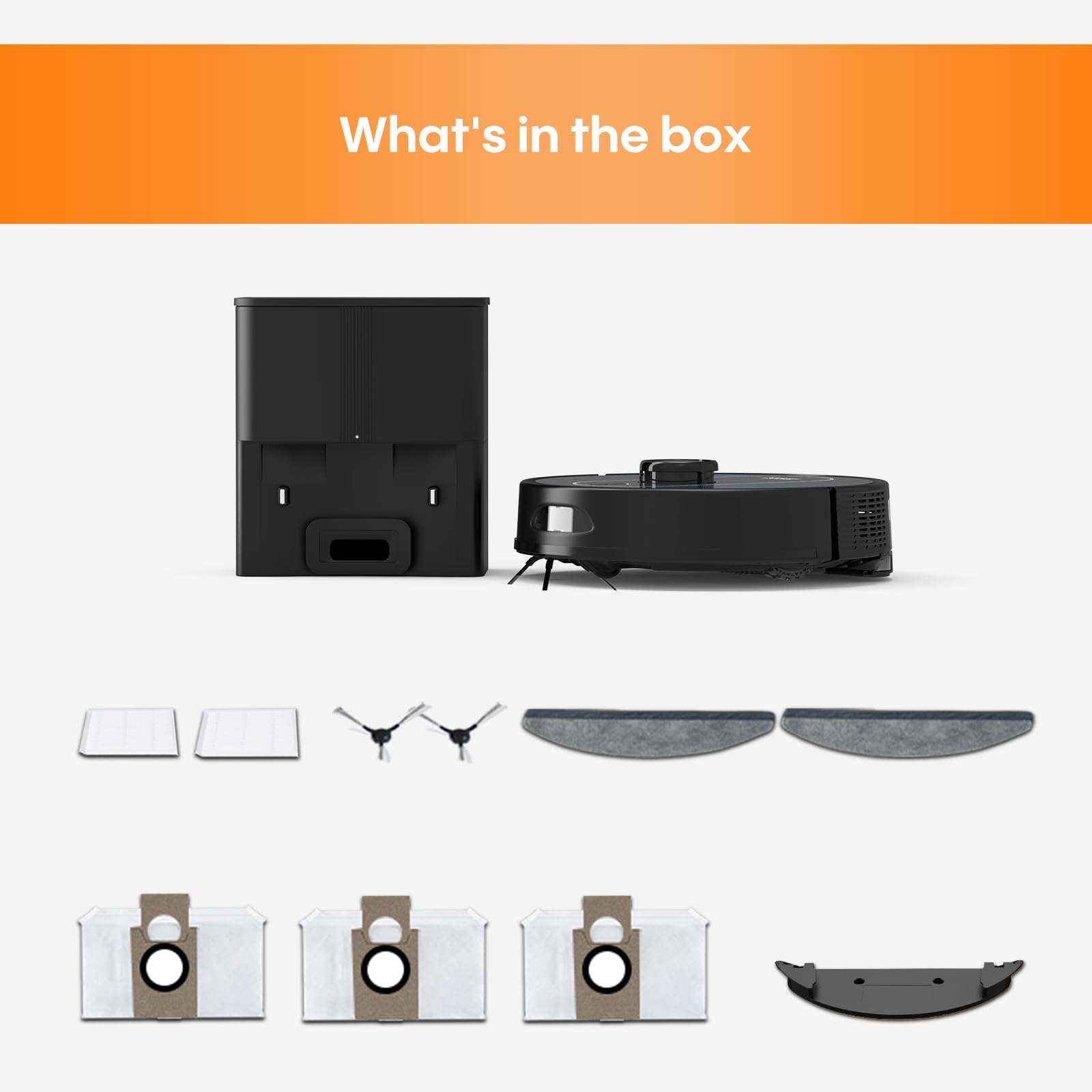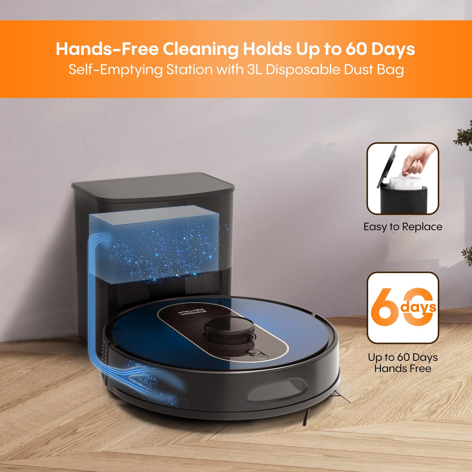 - 60 Days Hassle-Free Self-Emptying Station: Comes with a self-emptying base station equipped with a 3L dust bag capacity, offering you up to 60 days of hands-free cleaning. The ultra strong suction power base station can efficiently empty the dust and debris collected from the robot vacuum into the dust bag. Enjoy the hands-free cleaning, enjoy your free time.