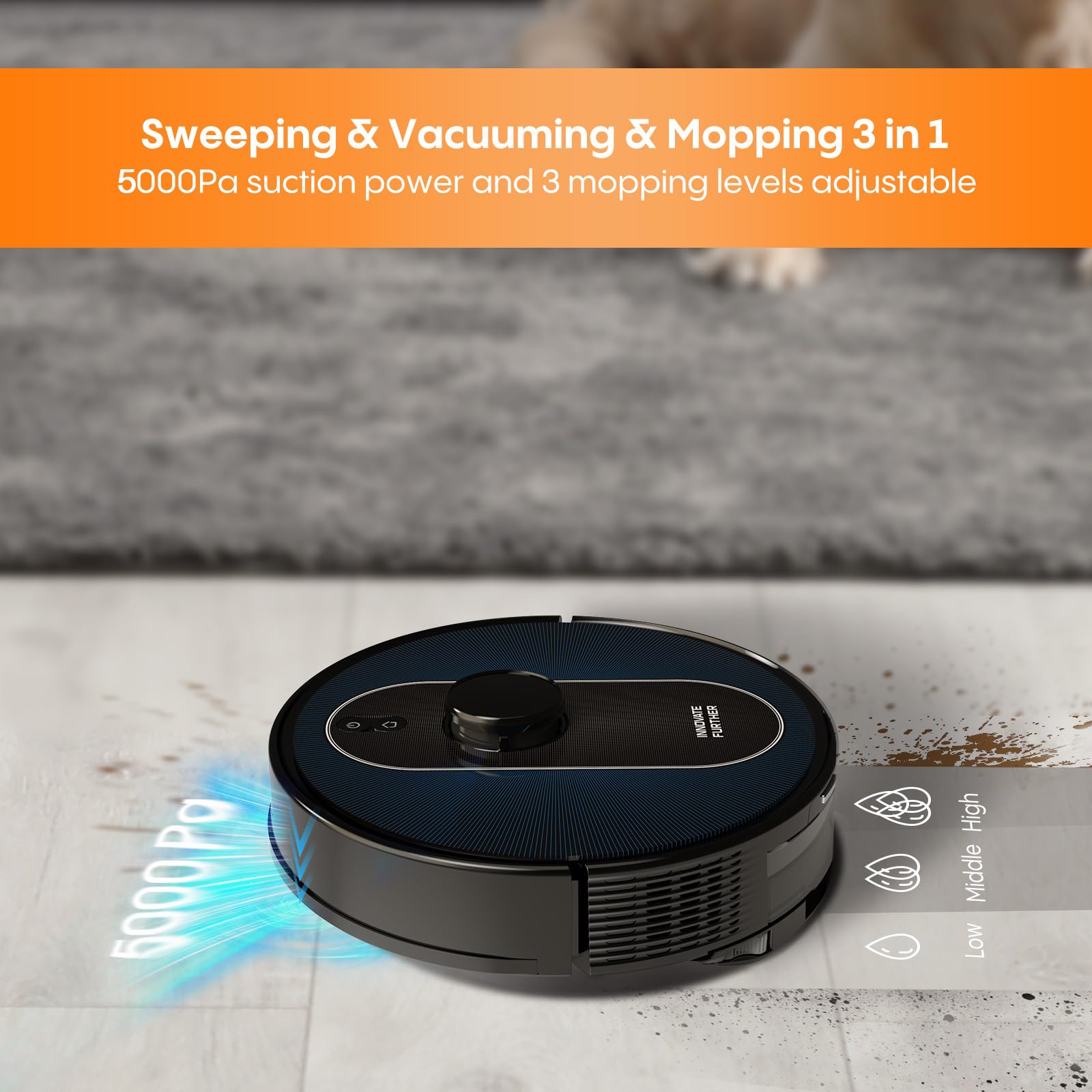 - 5000Pa Ultra Suction & Auto-Carpet Boost: Features with 5000Pa ultra strong suction power, easily pick up the household debris, deep dust and pet hair on hard floor and carpets. When it goes on the carpet, it will automatically enhance the suction power to the max for the deep cleaning efficiency. Keep the floor clean a whole day long.