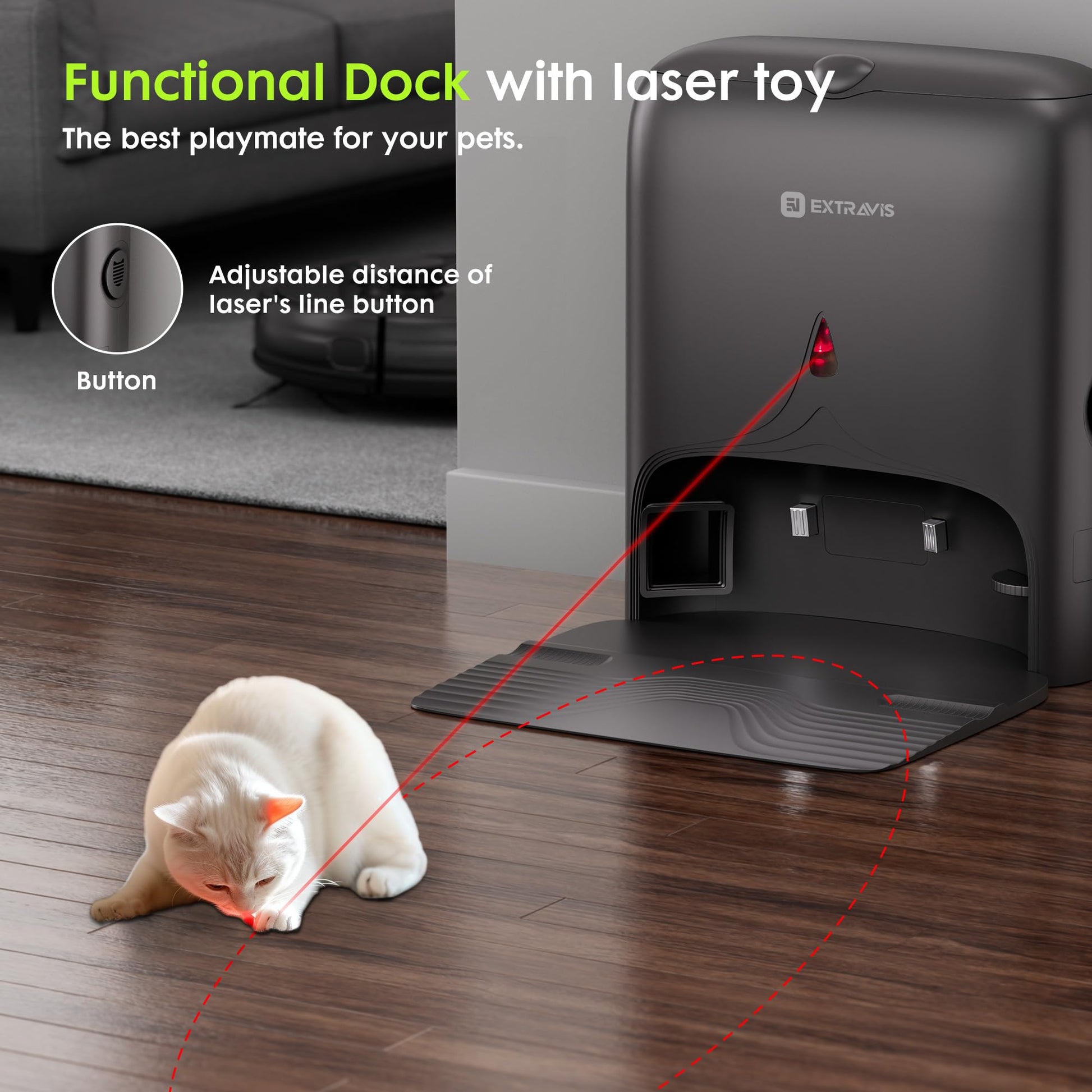 - Robotic Vacuum Cleaner with Laser Pet Toy: The world 1st robot vacuum equipped with a unique laser pet toy feature! While it cleans your floors with powerful suction, it also keeps your furry friends entertained. The built-in laser toy will engage and stimulate your pets, encouraging playful interaction while you take care of other tasks.