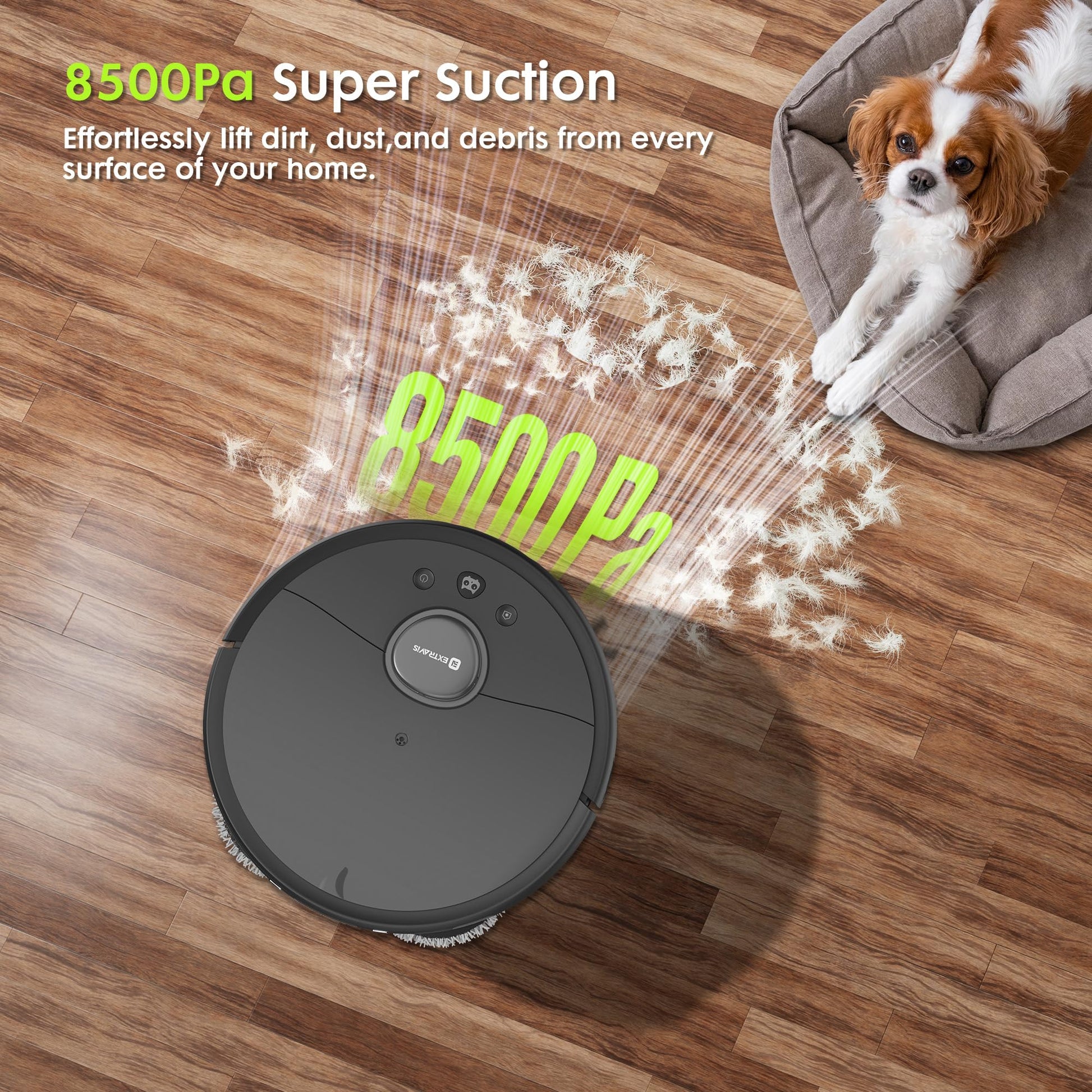 - APP control & Customized Modes: Our smart robotic vacuum cleaner with seamless Alexa, Google voice control and APP wifi connecting, along with convenient app functionality! Now you can easily command your vacuum to start, stop, or schedule cleaning sessions using just your voice. With our intuitive app, you can customize cleaning schedules, monitor progress, and control your vacuum from anywhere in your home. Extravis V5 robot vacuum only supports 2.4 GHz WiFi. Before first use, please fully charge the robotic vacuum cleaner.