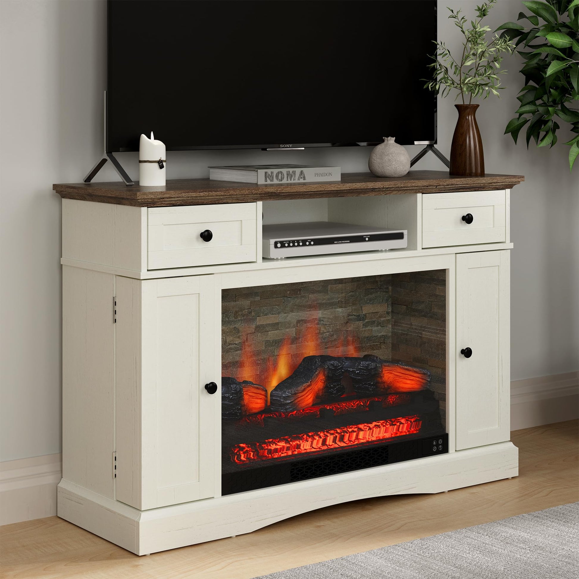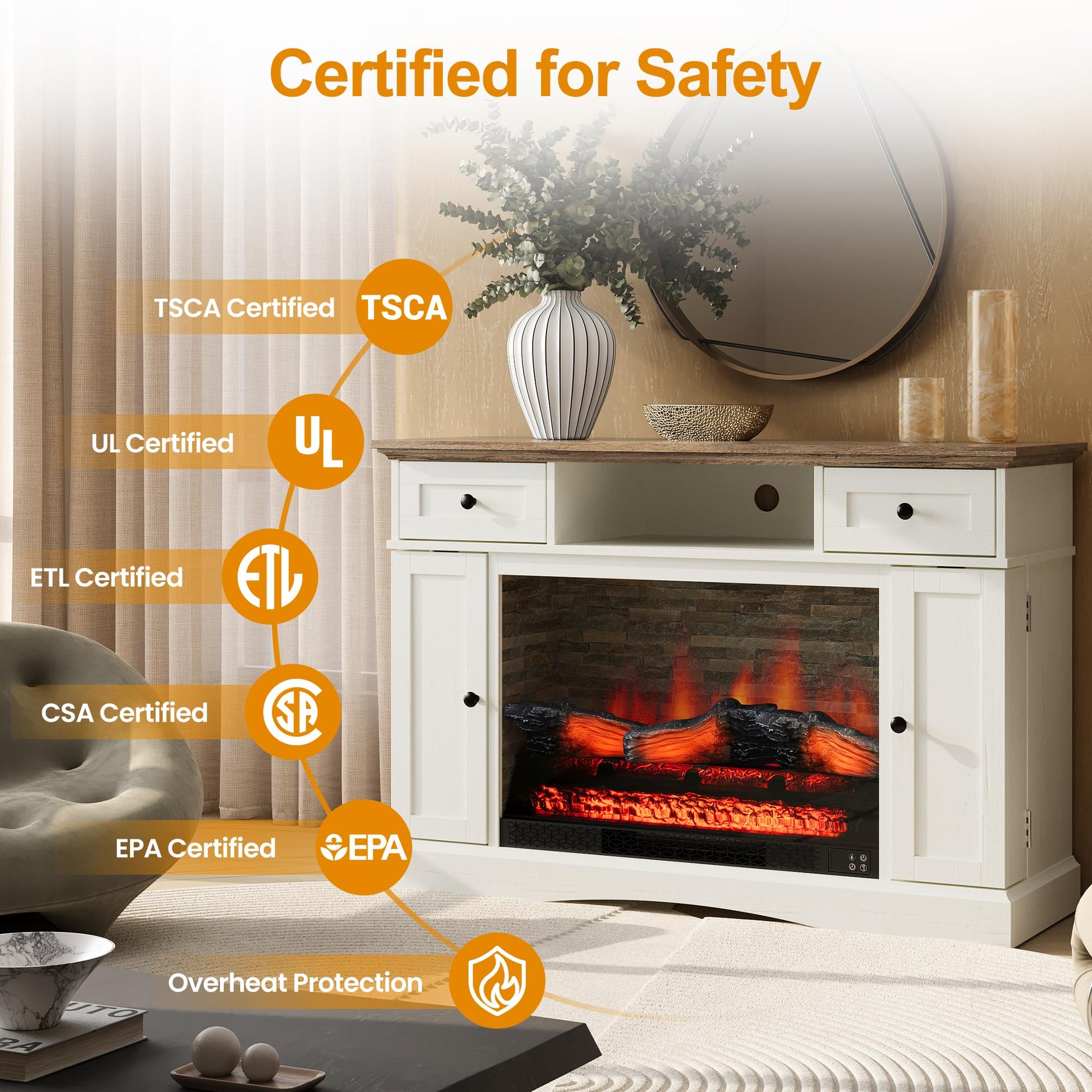 - Safty First: Crafted from premium engineered wood and TSCA/EPA certified, this TV cabinet features a UL and ETL-certified electric fireplace with CSA certification and smart overheat protection for a safe, cozy experience. Intuitive buttons and a convenient remote control make it easy to enjoy warmth at your fingertips.