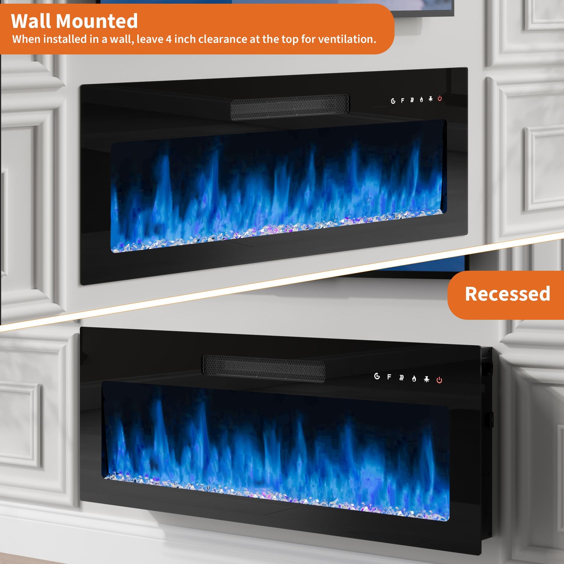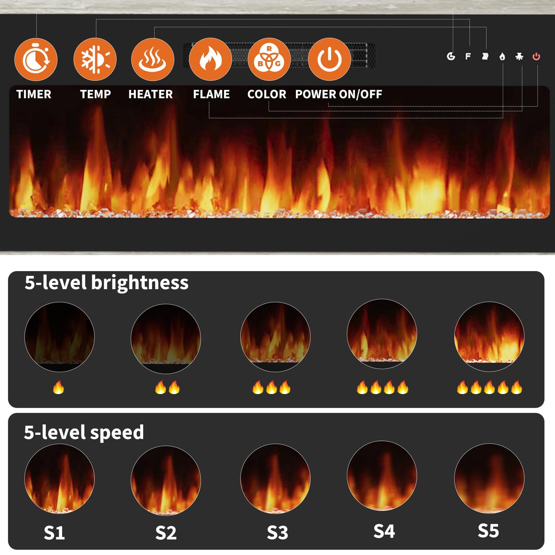 - Create your perfect atmosphere with easy touch controls: Choose from 7 flame colors, adjust how bright they glow, and control how fast the flames dance. The electric fireplace comes with crystal decorations that refract different lighting effects through the light when the power is turned on.