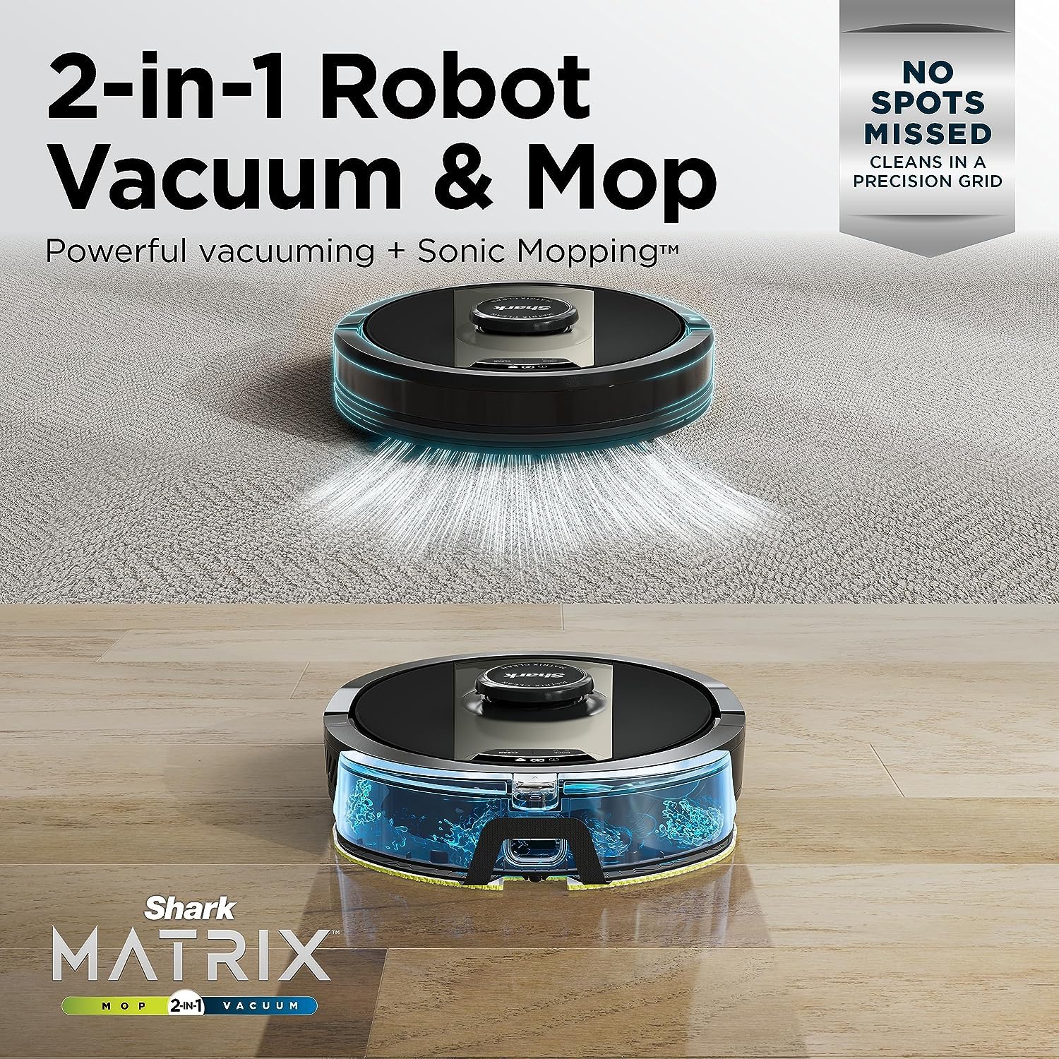 - WHAT’S INCLUDED: (1) Shark Matrix Robot, (1) Charging Dock, (1) Side Brush, (1) Filter, (2) Microfiber Reusable Mopping Pads, 12oz. Starter VACMOP Cleaning Solution.