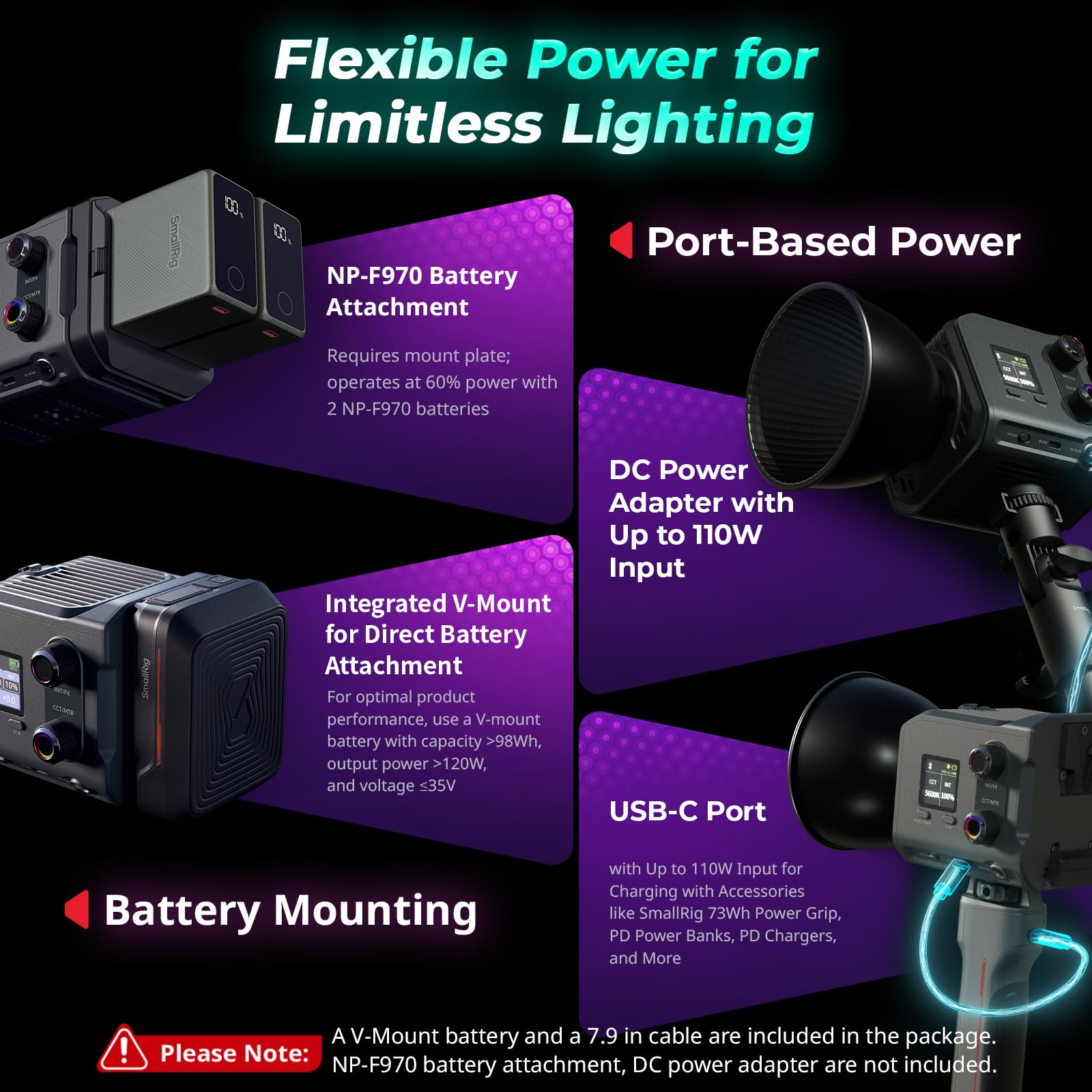 - Complete Accessory Solution: A comprehensive range of accessories is included, fully compatible with SmallRig's mini-mount lighting modifiers (D30, D60, 45x45 softbox, SP-mini spotlight), battery accessories (V-mount and NP-F970 batteries, NP-F battery plates), and mounting accessories (light stand adapters, Bowens mount adapters, magic arms). This provides users with a one-stop solution for portability, convenient power supply, easy control, high-quality light source, and complete accessories