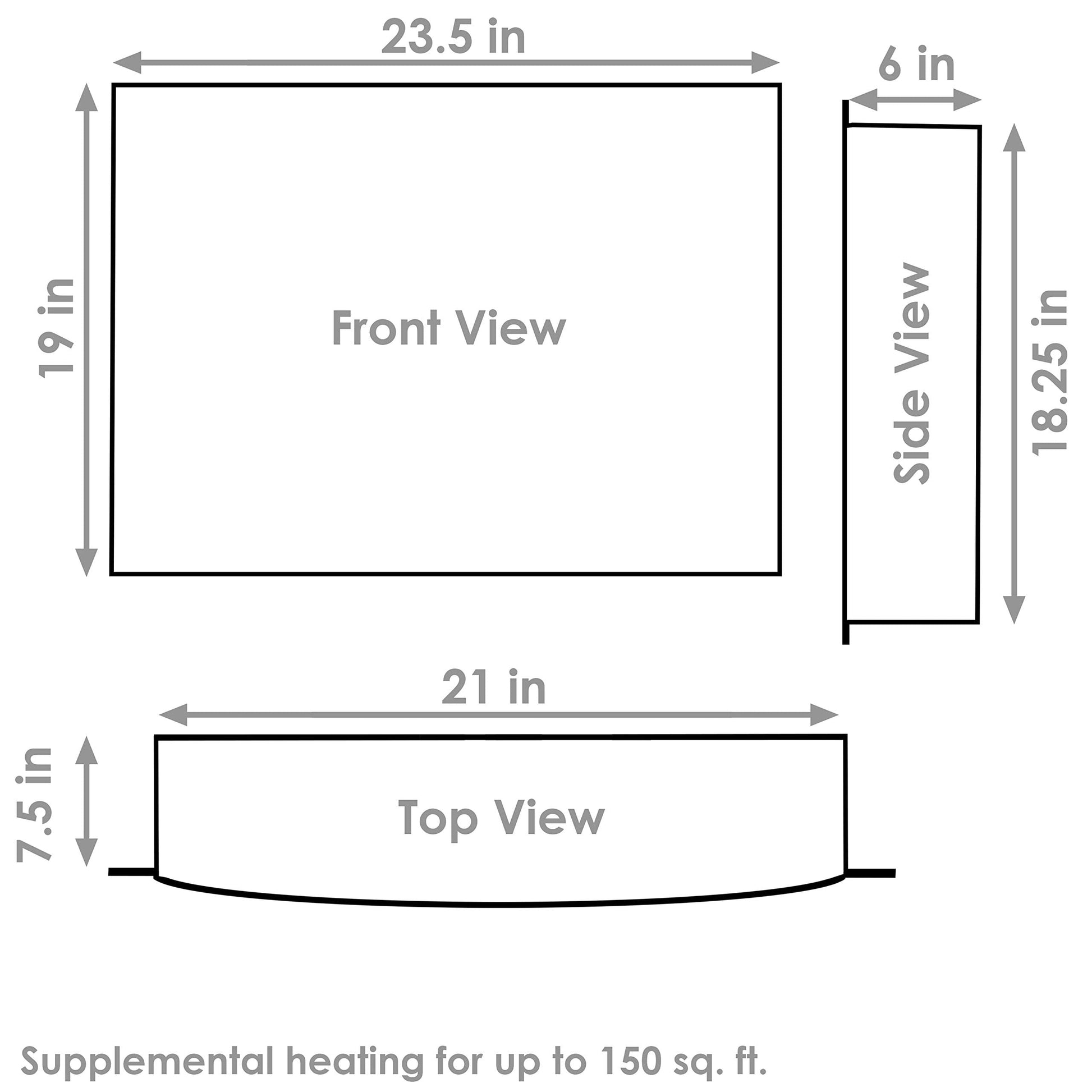 - COZY WARMTH: The fireplace measures 23.5' W x 7.5' D x 19' H. The insert measures 21' W x 6' D x 18.25' H. The unit weighs 26.8 lbs. The BTU output is 5,120 BTUs. The heat settings are 750 W - 1500 W. It has 12.5 amps and 100-127 volts. The cord length is 72'. It provides supplemental heating for up to 150 square feet.