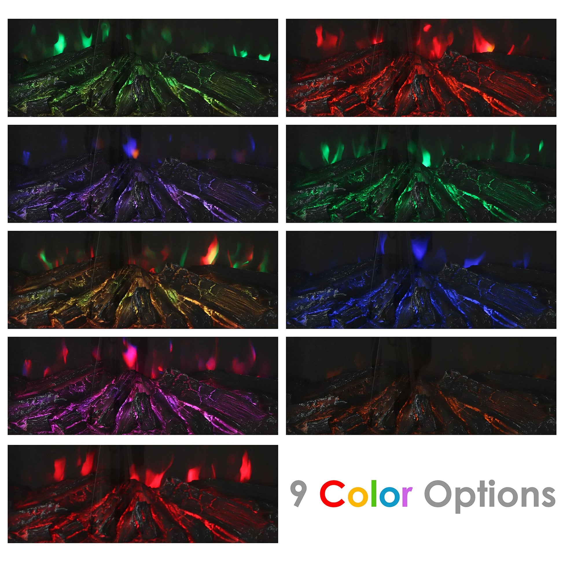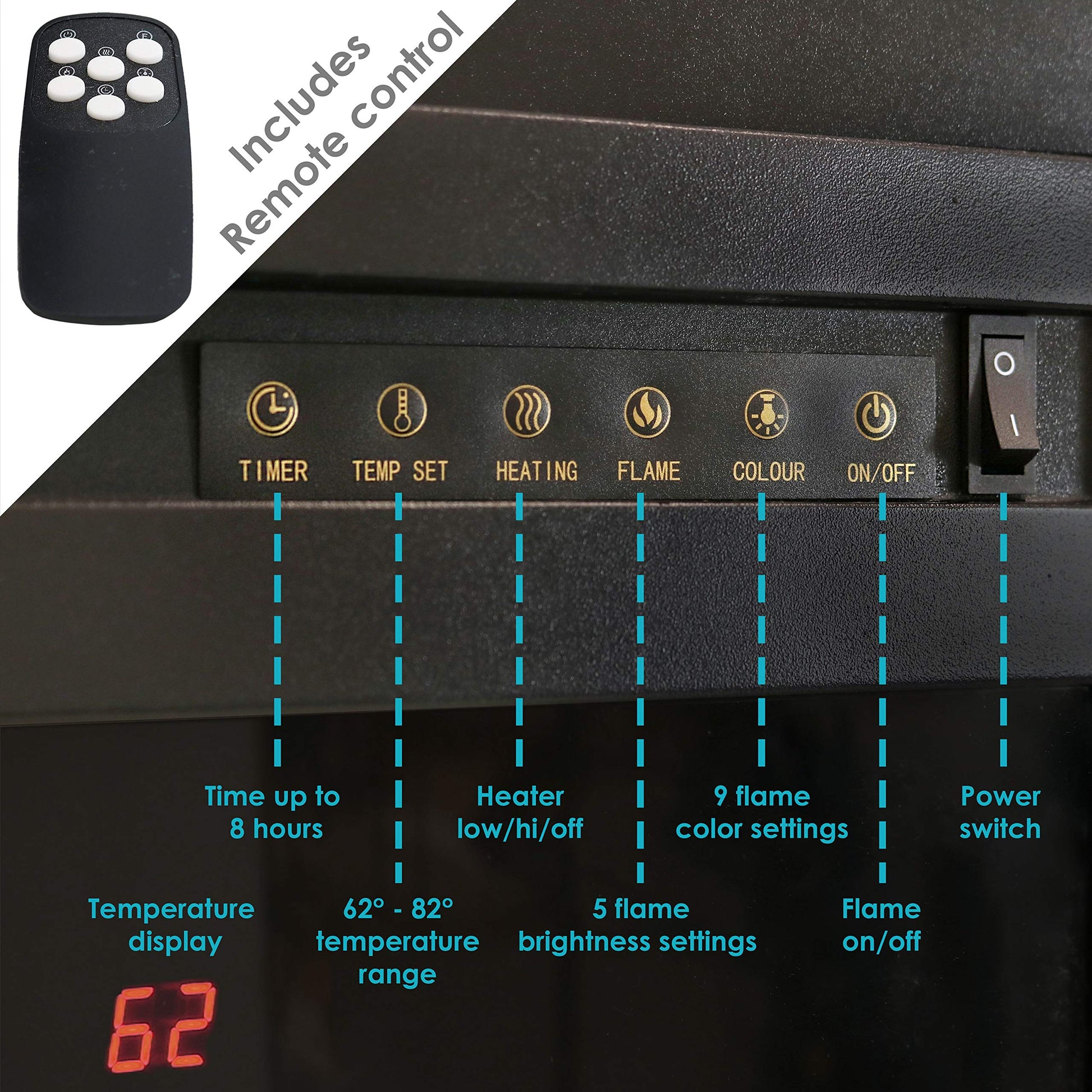 - A VARIETY OF HEATING AND DISPLAY OPTIONS: This unit features front vent heating that can be turned on or off and temperature limited control for additional safety. Use either the unit buttons or remote control to choose from a variety of heat and display options to create the right atmosphere. This electric fireplace offers 9 flame color options, adjustable temperature settings from 62 to 82 degrees Fahrenheit, 5 levels of flame and log bed brightness, and a 1- to 8-hour timer.