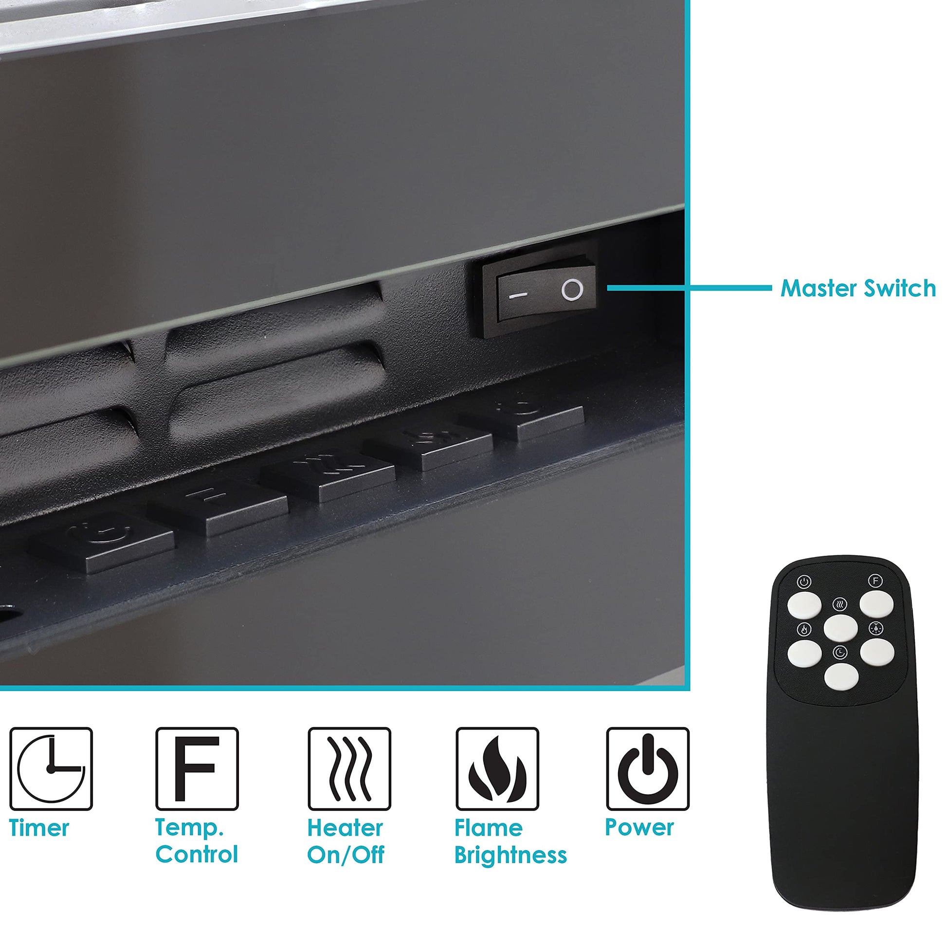 - A VARIETY OF HEATING AND DISPLAY OPTIONS: This unit features front vent heating that can be turned on or off and temperature limited control for additional safety. Use either the touch screen or remote control to choose from a variety of heat and display options. This electric fireplace offers 3 flame color options (red, blue, and purple), adjustable temperature settings from 60 to 82 degrees Fahrenheit, 5 flame brightness options, and a 1- to 8-hour timer.