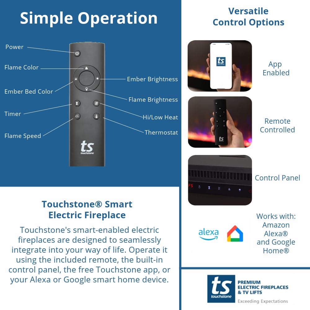 Touchstone Sideline Elite Smart 60” WiFi-Enabled Electric Fireplace - in-Wall Recessed - 60 Color Combinations - 1,500W Heater - Black - Log, Crystals & Driftwood - 80037