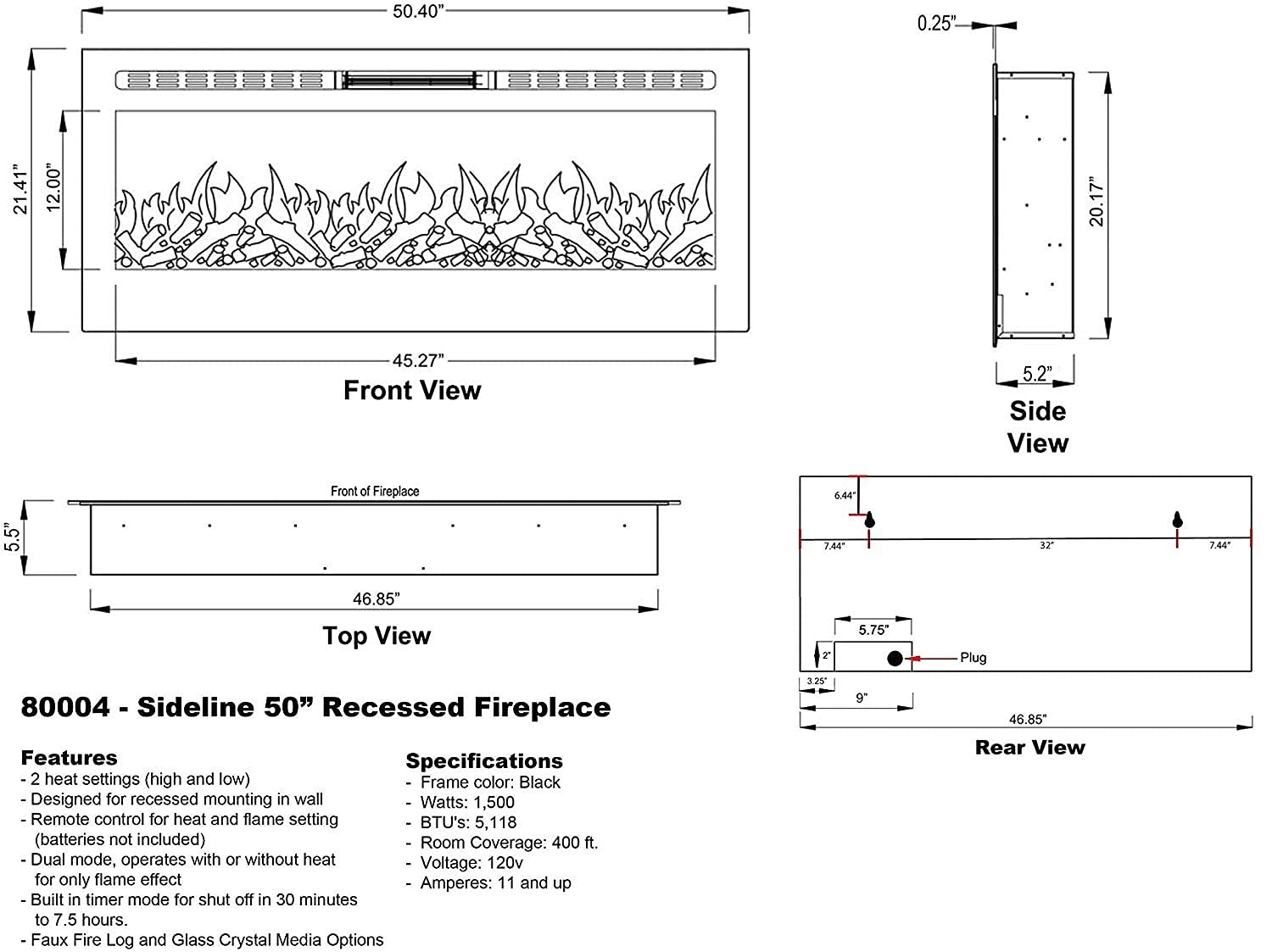 - INSTALLATION: This Sideline installs simply and can safely be attached to framing studs. The sides & back of the unit remain cool to the touch with the heat feature on. Recommended minimum of 8” of space between the top of the fireplace and your TV, mantel, picture ceiling. The Sideline can be installed in existing fireplace openings safely. Consult with a licensed professional to ensure your unused gas lines and vents are secured properly. The Sideline fireplace is ventless.