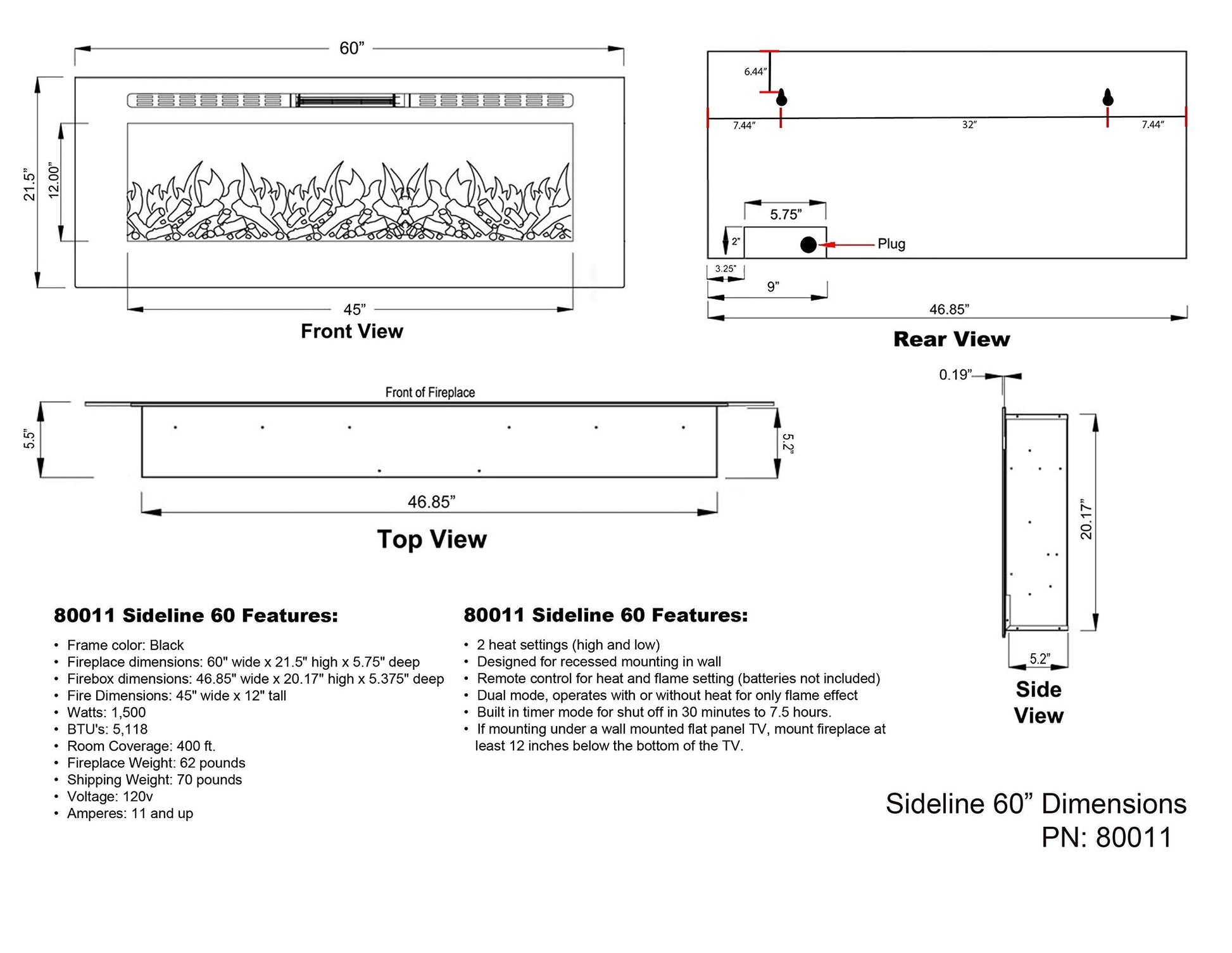 - FEATURES: The Sideline features an unmatched flame. Friends will be nervous to touch realistic flame behind the glass. The Sideline includes faux-fire logs & crystals to create an authentic feel, as well as an IR remote controlling flame color & intensity, the heater and shut-off timer. Front facing heater vents allow you to position the Sideline just 8” under a flat screen TV. The Sideline can be hardwired or plugged in to your electric source.
