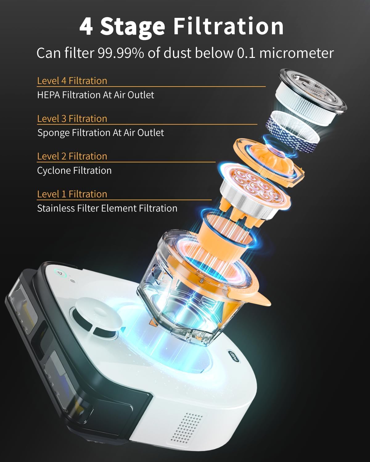 - ✅ POWERFUL 22,000PA SUCTION – With 4 adjustable levels (9,000-22,000Pa), UBPET Robot Vacuum delivers industry-leading suction to deep clean carpets and remove embedded pet hair. The Turbo mode (22,000Pa) tackles tough messes, while Eco mode (9,000Pa) saves battery for daily hard floor cleaning - making it the best robot vacuum for pet hair and mixed flooring.