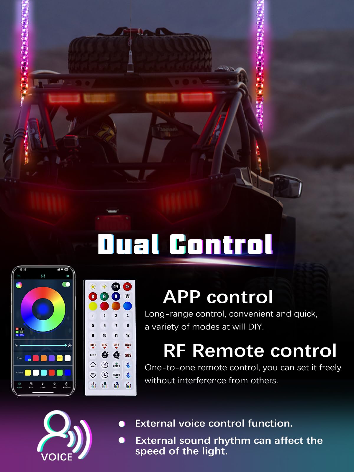 - Sound-Activated Mode: Built-in microphone responds to external sounds, adjusting the light flow speed accordingly. Flexible Yet Durable: The whip light pole is slightly flexible to absorb impact and enhance safety, but not overly soft to avoid breakage.