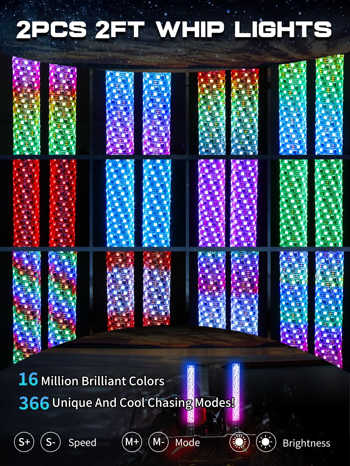 - Dual Control: Dual control by APP and RF remote control. You can DIY your own lighting effects through IOS or Android app, whether it's color, brightness, speed can be controlled. You can even synchronize the whip light with the music rhythm. Convenient and quick, let you enjoy a party on wheels