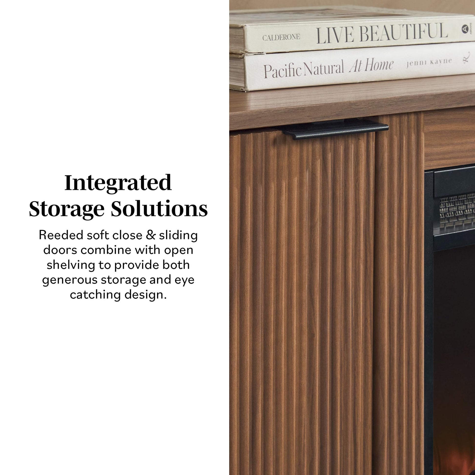 Details: Grab the remote and blanket, because cozy nights in are about to get even better. This modern reeded 70” fireplace TV stand brings warmth and stylish storage to any room in the home. Reeded, sliding wrap-around doors conceal your media devices, cords, and books, while the removable fireplace insert invites you to sit back and relax. Enjoy the welcoming flame with or without heat, from fall and winter all the way through spring and summer. Made from warp-resistant MDF and scratch-resistant laminate, this dual-purpose TV stand is durable enough for everyday use. The generously sized surface fits TVs up to 75 inches, so you can get up close and personal with your favorite reality TV, sports games, and sitcoms.