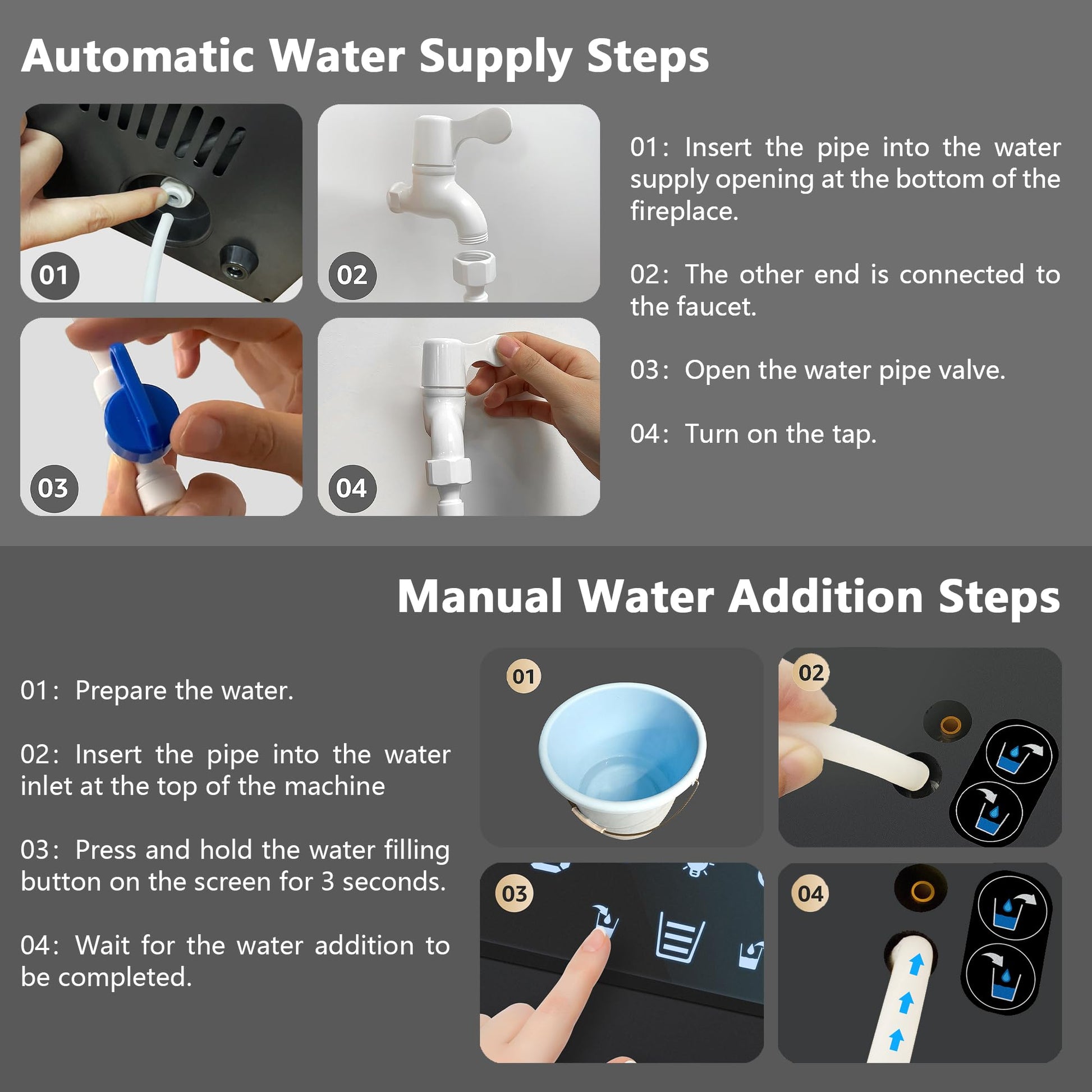 - đ„ăSafe and Energy Savingă: The automazied fieplaces use LED technology, Only need to add purified water or filtered water, save time and energy as this fireplace produces no messy or harmful things, safe for people and pets. The heat maintains the natural humidity in the air , which will not make the room too dry.And the fireplace sound is suitable.