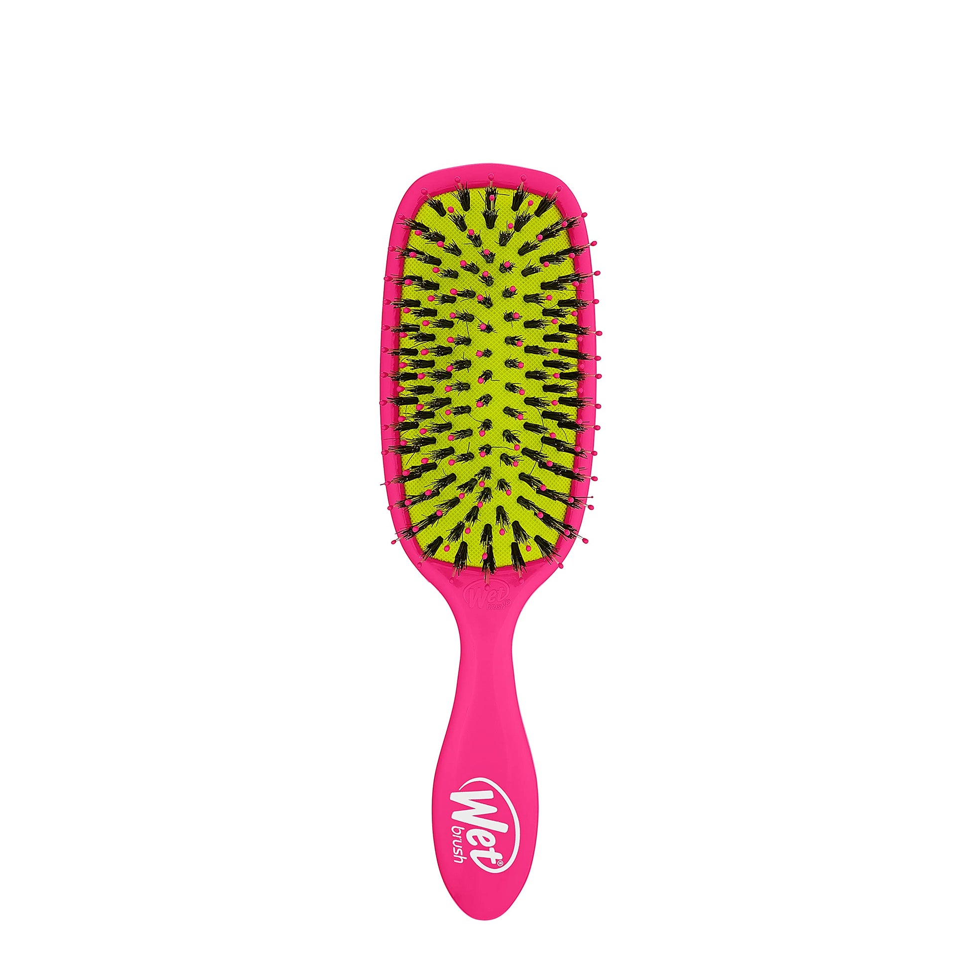 Details: Wet Brush Shine enhancer, pink, natural boar IntelliFlex bristles glide through tangles with ease and leave hair shiny and smooth. Works well to evenly distribute your hairs natural oils and dry shampoo. Glides through tangles minimizing pain, split ends and breakage. Best for all hair types. Also ideal for dry shampoo distribution Wet Brush Shine enhancer- pink.